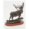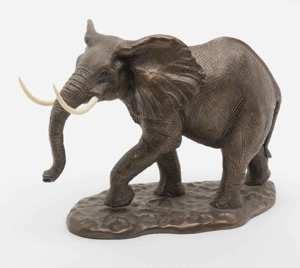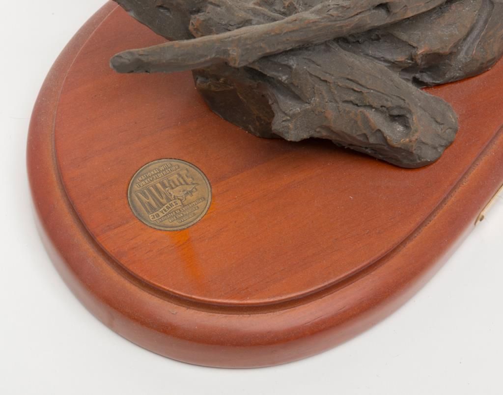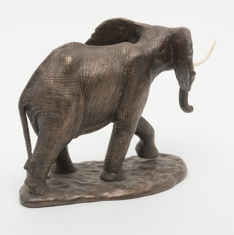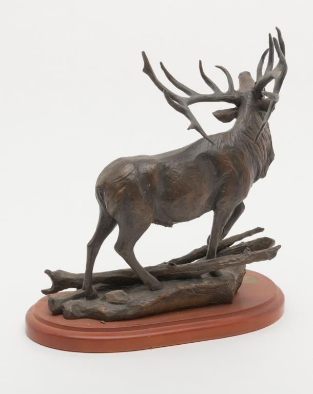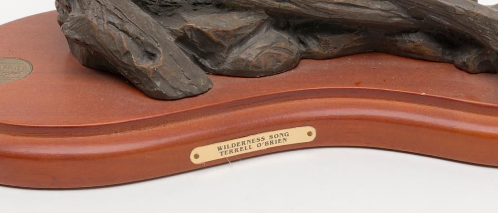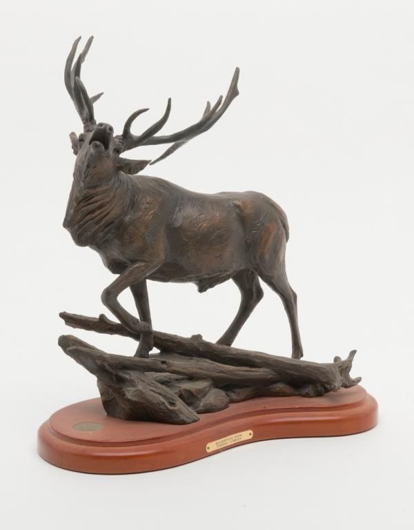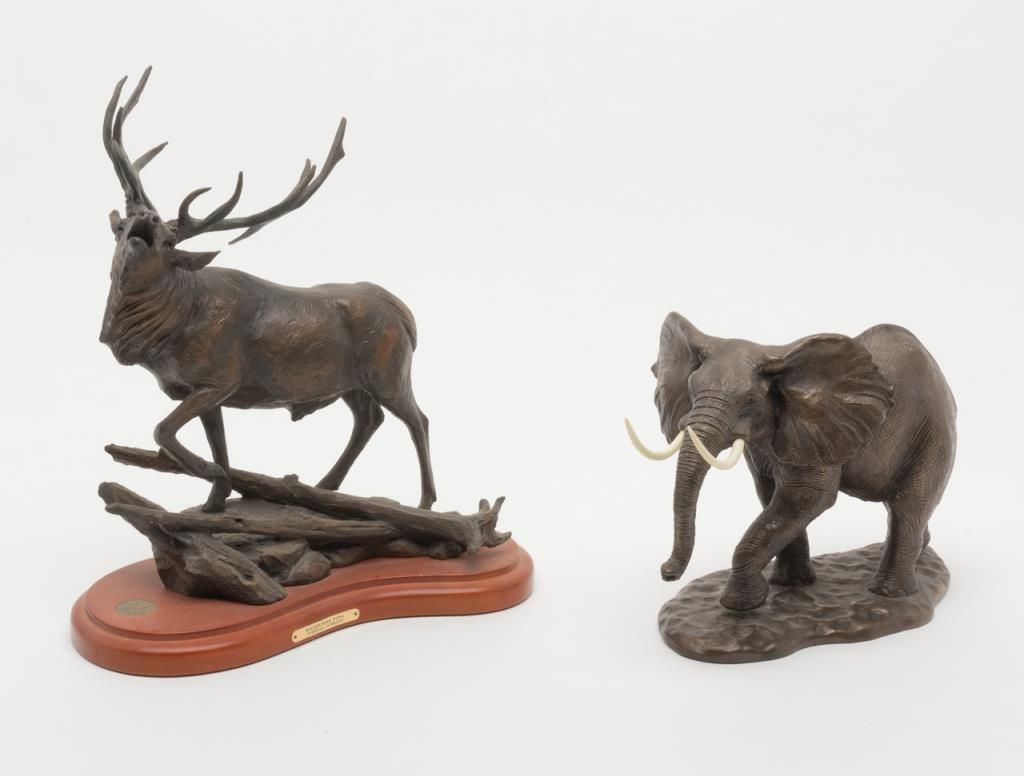 Lot of two non-metallic cast artworks. Number 1 shows bull elk bugling entitled “Wilderness Song” by Terrell O’Brien with plaque from “National Wild Turkey Federation 30 Year Commemoration”. The figure measures approximately 15” in height by 15½” across the base and is nicely finished with a bronze color. Number 2 is a cast non-metallic figure of bull elephant with removable tusks unsigned and unmarked. Approximately 10” in height by 14”. The casting material is a composite.Est.: $150-$300