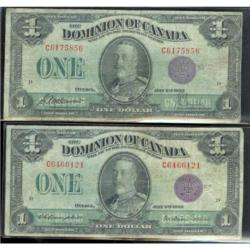 Lot of two notes. 1923 $1 Purple seal McCavours-Saunders/Campbell-Sellar DC-25k/l Both signatures included. Grades vary from VG to Fine