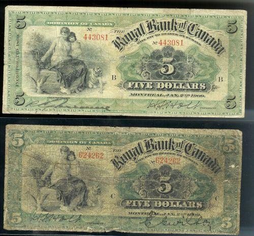 Lot of two notes. The Royal Bank of Canada 1909 $5 CH-630-10-14-02/06. Green and Black 5. Two very rare varieties. First pair handled by the cataloguer. Grades vary from VG to fine.