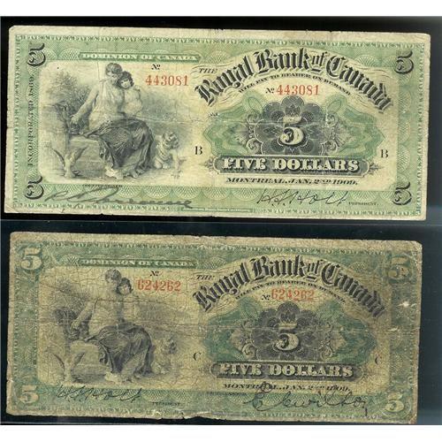 Lot of two notes. The Royal Bank of Canada 1909 $5 CH-630-10-14-02/06. "Green and Black" 5. Two very rare varieties. First pair handled by the cataloguer. Grades vary from VG to fine.
