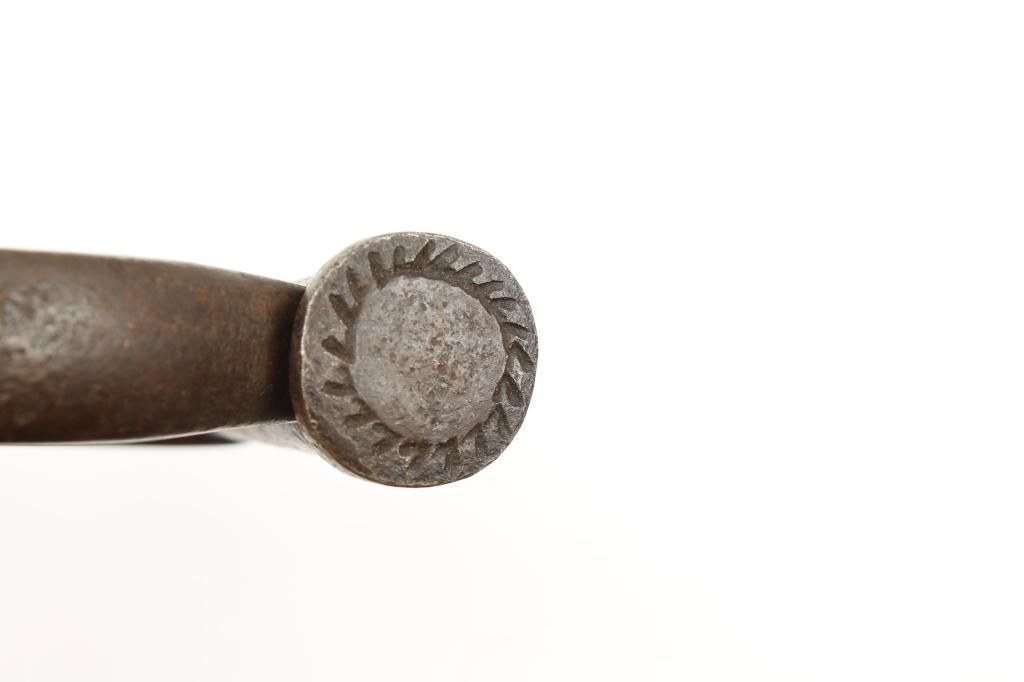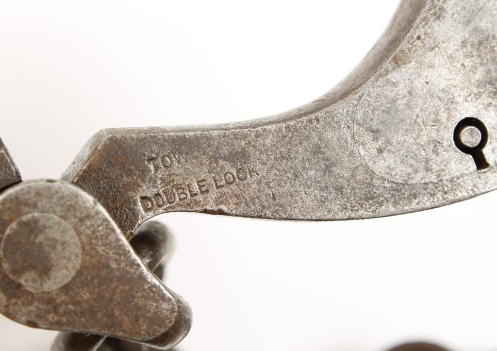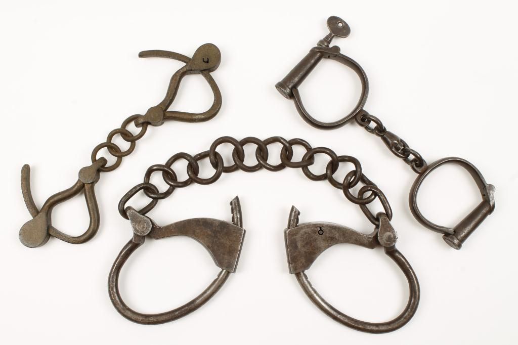 Lot of two old 19th century era handcuffs and one pair of leg irons. All three are unmarked. Show rust and normal aging. Fair to good condition. All are original. Est.: $300-$600.