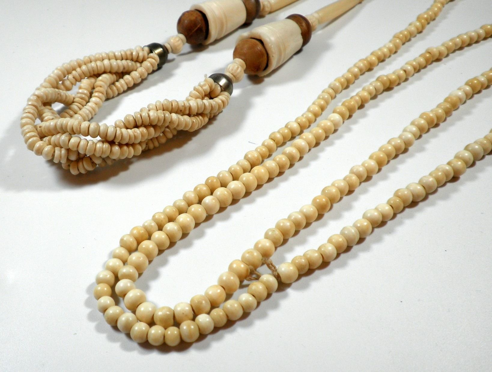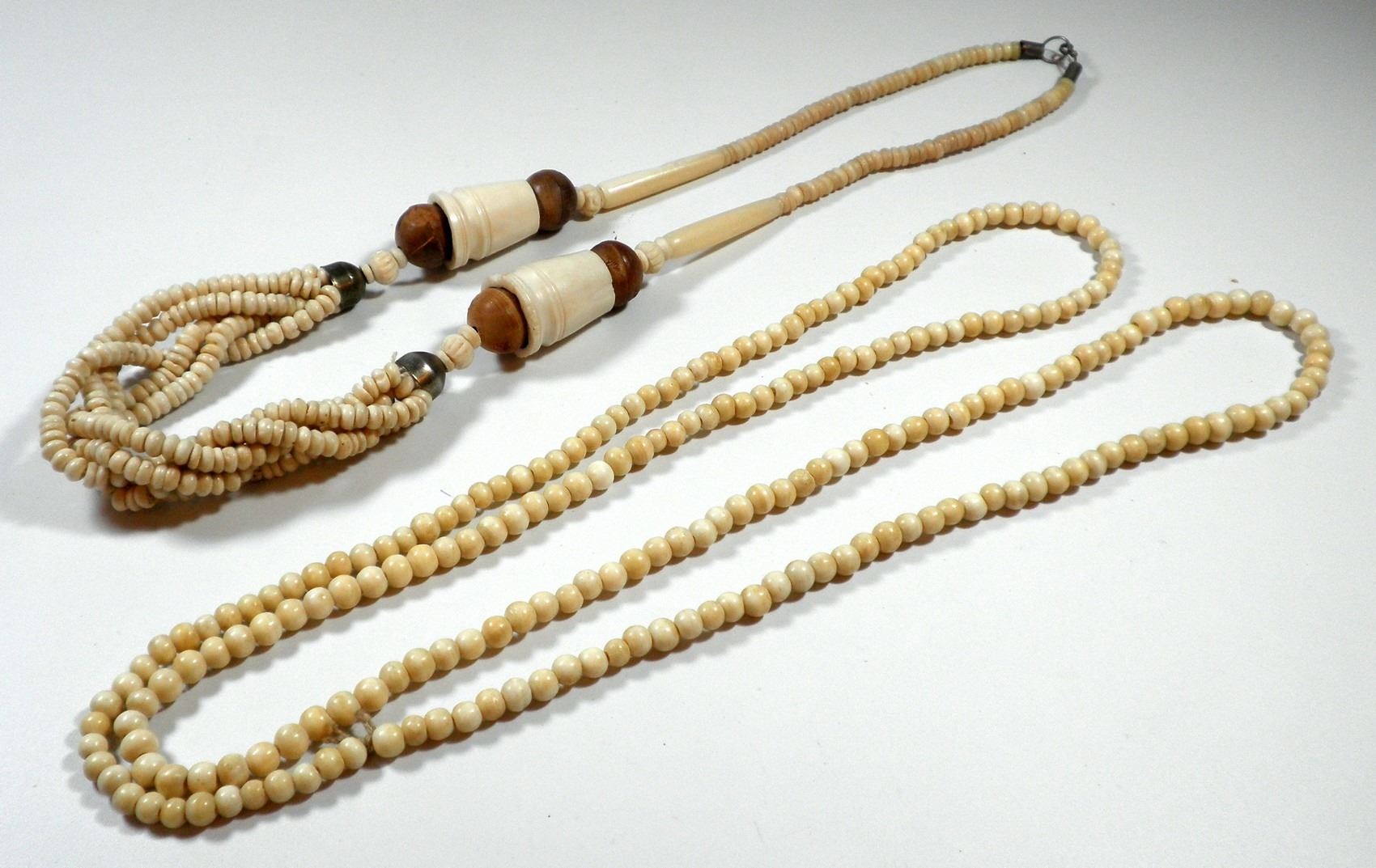 Lot of two old ivory necklaces, one has ball-shaped carved ivory beads, and the other is mostly composed of oval carved ivory beads in the middle, a number of necklaces entwined. A number of large wooden beads on the sides, with large cone-shaped ivory parts, total weight: 110 gm, length: 60-112 cm.