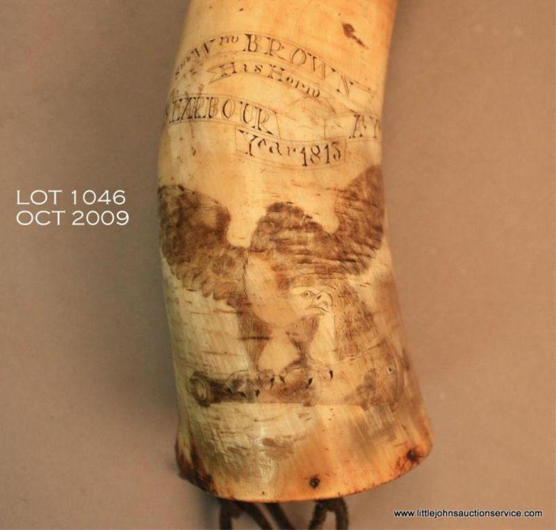 Lot of two old powder horns including an old buffalo horn, approx. 12” overall with some worm damage, copper spout and base;The other horn is a large steer horn, approx. 17” overall with a Spread Eagle scrimshaw and inscription “Sm WmBrown, Sacketts Harbour, At Ye Lake, Year 1813”. Although we have some reservations about the period of inscription, the horn is accompanied by an authentication letter dated Oct. 13, 1982 from antique dealer Edward L. Kreinheder ofWarrensburg, NY: A finely done horn in any case. Est.: $500-$750.
