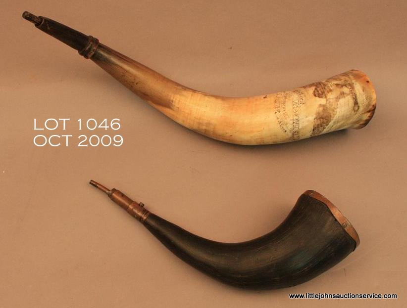 Lot of two old powder horns including an old buffalo horn, approx. 12” overall with some worm damage, copper spout and base;The other horn is a large steer horn, approx. 17” overall with a Spread Eagle scrimshaw and inscription “Sm WmBrown, Sacketts Harbour, At Ye Lake, Year 1813”. Although we have some reservations about the period of inscription, the horn is accompanied by an authentication letter dated Oct. 13, 1982 from antique dealer Edward L. Kreinheder ofWarrensburg, NY: A finely done horn in any case. Est.: $500-$750.