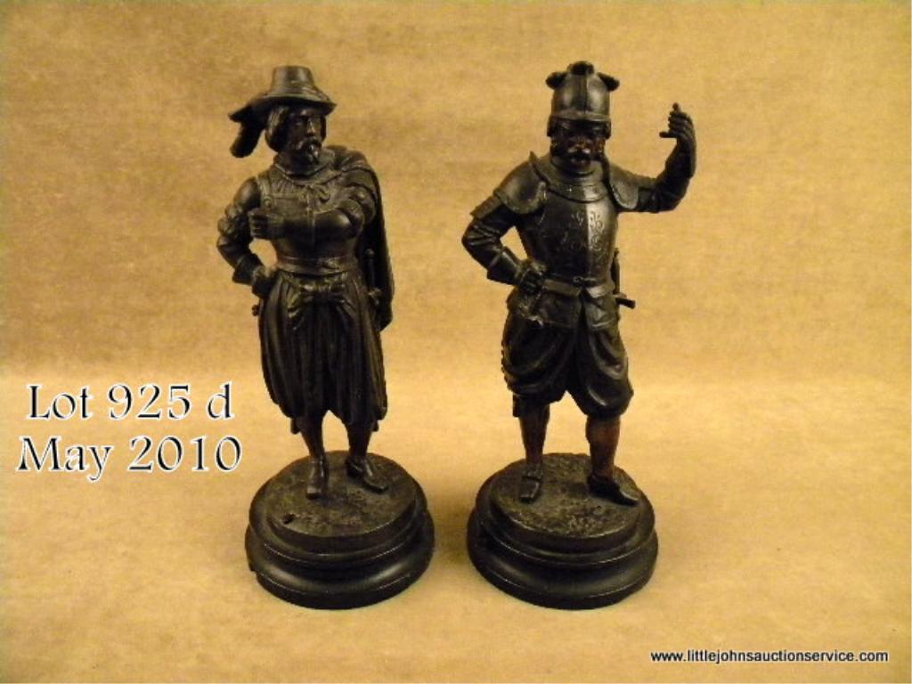 Lot of two old small bronze-like statue of a  Conquistador approx. 12” high with a nice dark  patina showing him in period armor with sword and  knife at his side; appears to have had a pike in  one hand at sometime but now missing; the other aEuropean gentleman in his finery, also approx. 12”  in height showing a matching patina to the first  piece and may have acted as the second half of a  pair, in overall good condition also but with  slight damage to a belt knife (piece retained andrepairable) and also missing what appears to be a  pike; from an old estate.  Est.:  $200-$400.