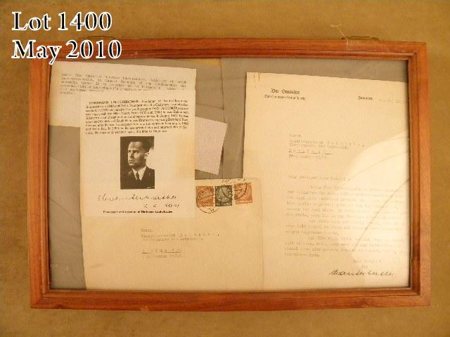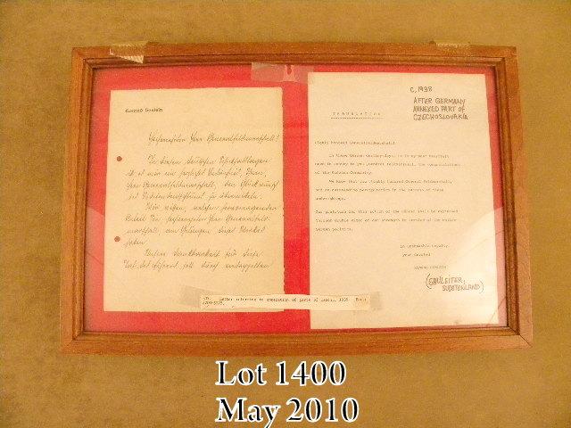 Lot of two original German letters, one with its original stamped envelope; the first circa 1938 when translated is referring to Germany’s annexation of parts of Czechoslovakia; the other (with the envelope) is from Gauleiter HartmannLauterbacher to General Reinecke of the Oberkommando der Wehrmacht. Lauterbacher was Gauleiter of South-Hannover-Brunswick from 1940-1945; prior to that time frame he was largely involved with the Hitler Youth; after the war, he escaped from a prison camp in 1948 and fled to Italy where he was re-captured and returned to Germany; he apparently escaped again and moved to Argentina. Both of these historic documents are contained in wood and glass display cases. Est.: $150-$300.