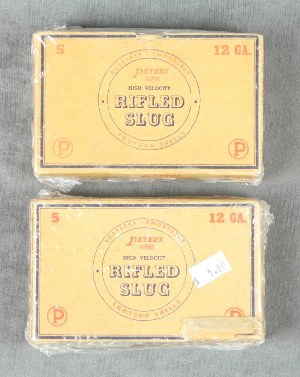 Lot of two original boxes of Peters High Velocity 12 Gauge rifled slug shotgun shells (5 to a box); wrapped in cellophane and in overall very good condition. Est.: $20-$40.