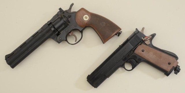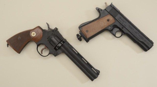 Lot of two pellet guns including a Crosman air gun in form of a Colt Python DA revolver in overall good condition and a Daisy power line Model 45 CO 2 in the shape of a Colt 1911 A1 semi-auto pistol, .177 cal. also inoverall good condition; operating condition of both, unknown. Est.: $50-$75.