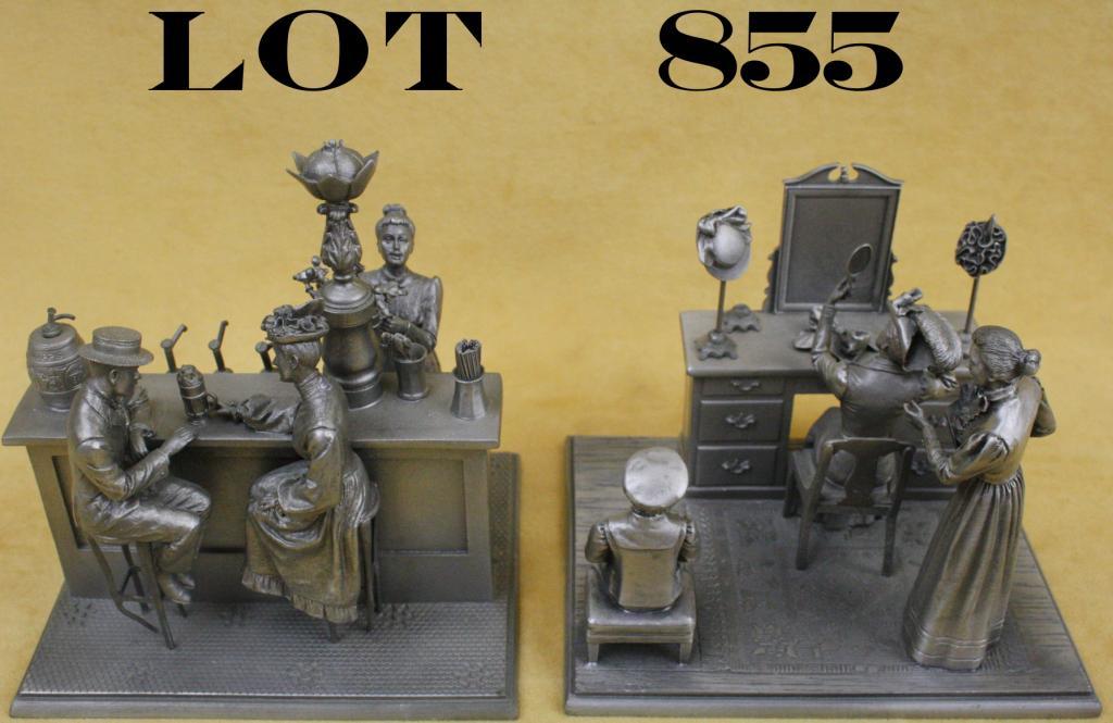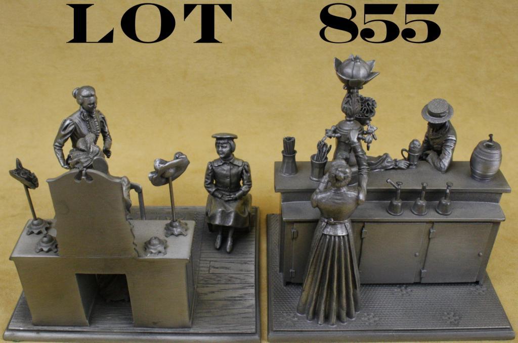 Lot of two pewter limited edition Franklin Mint displays, one entitled “The Millinery Shop” by Albert Ciriaco, copyright 1978, approx. 5” square and about 4” in height showing a woman trying on a fancy hat withher daughter and a sales person looking on; the other entitled “The Soda Fountain” also by Albert Ciriaco, copyright 1977, approx. 5” by 4” by approx. 5” high showing a man and woman at a soda fountain with waitress behind the counter; nicely executed and detailed. Est.: $75-$150.