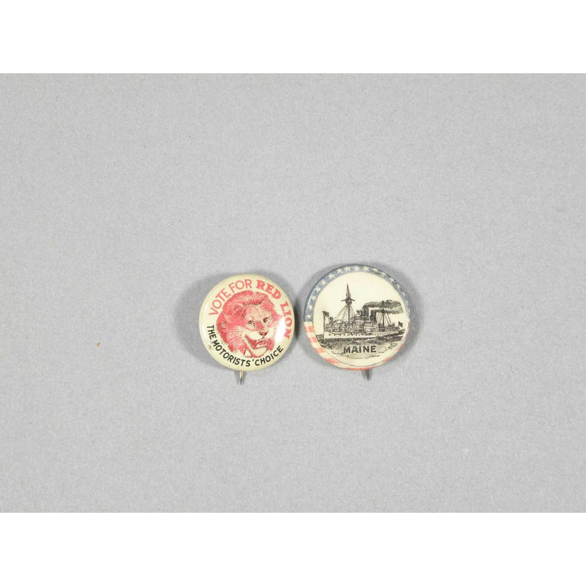 Lot of two pin backs. Tin, Red Lion Gasoline. Celluloid, Remember the Maine. Both in excellent condition. 3/4 inch diameter.