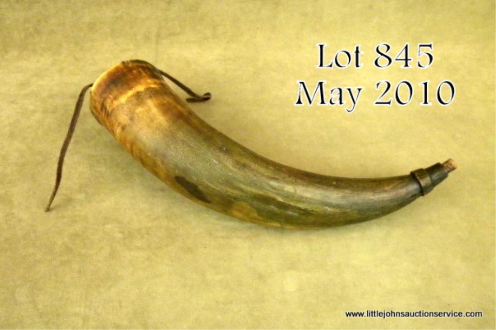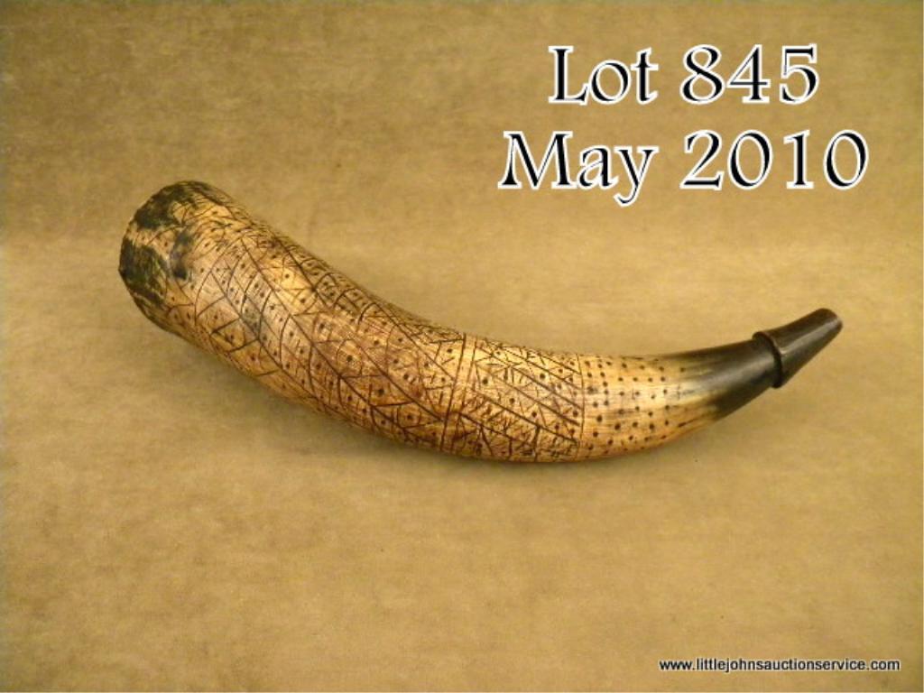 Lot of two powder horns, the first being approx.12” overall with a wood base plug, lots of wear and a great look; the other is a scrimshawed old horn approx. 14” overall showing a repeating square and dot design with a date “1758” and theinitials “R” or “OR” around the horn base and the initials “HR” carved into the wood plug with a vertical bar intersecting the horizontal leg of the “H” that connects to the “R”. This horn is in well worn condition and is accompanied by a letter from Edward L. Kreinheder Antiques of Warrensburg, NY, dated Oct. 2, 1981 indicating that when he purchased the horn in a big collection, it was said to have been the horn of a Mohawk Indian in service with the British in theFrench and Indian War. An interesting story that may be researchable but sold as is. Est.: $200-$400.