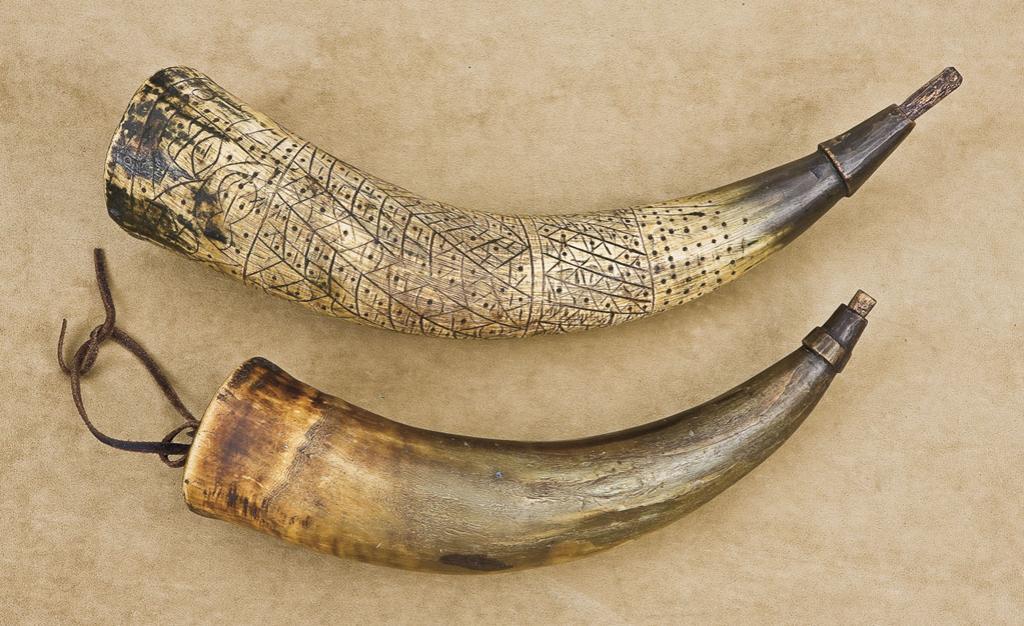 Lot of two powder horns, the first being approx.12” overall with a wood base plug, lots of wear and a great look; the other is a scrimshawed old horn approx. 14” overall showing a repeating square and dot design with a date “1758” and the initials “R” or “OR” around the horn base and the initials “HR” carved into the wood plug with a vertical bar intersecting the horizontal leg of the “H” that connects to the “R”. This horn is in well worn condition and is accompanied by a letter from Edward L. Kreinheder Antiques of Warrensburg, NY, dated Oct. 2, 1981 indicating that when he purchased the horn in a big collection, it was said to have been the horn of a Mohawk Indian in service with the British in the French and Indian War. An interesting story that may be researchable but sold as is. Est.: $200-$400.
