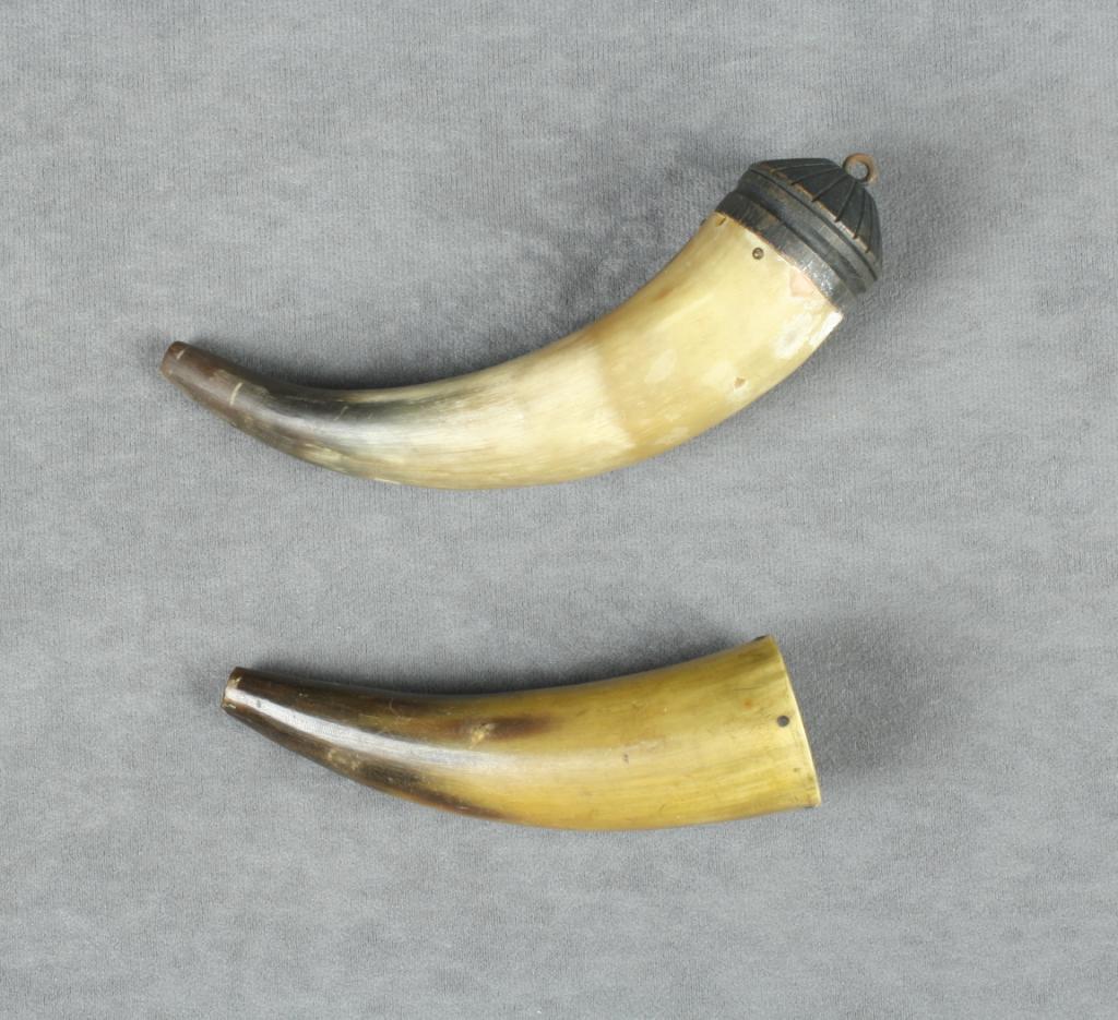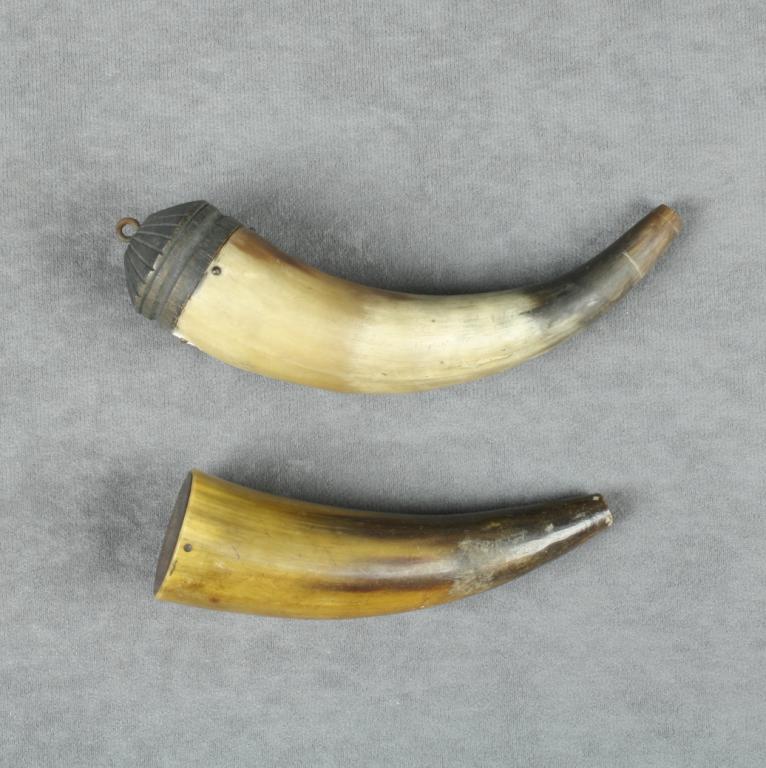 Lot of two priming horns, both approx. 5” overall, one with a flush wood plug, the other with a carved wood plug and small iron hanging eyelet; both overall good; one with some slight worm damage. Est.: $75-$150.