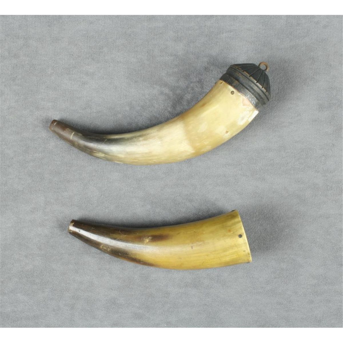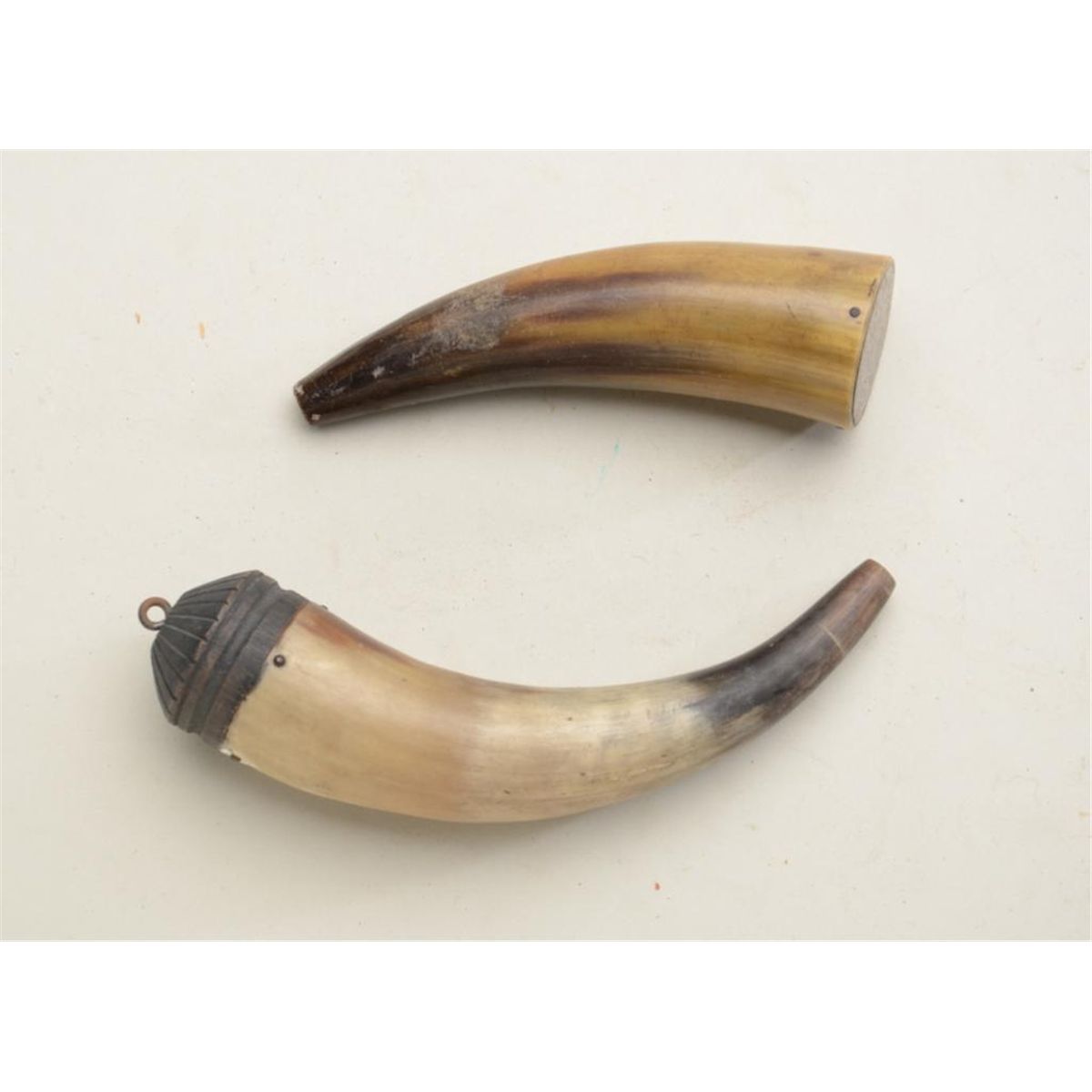Lot of two priming horns, both approx. 5” overall, one with a flush wood plug, the other with a carved wood plug and small iron hanging eyelet; both overall good; one with some slight worm damage. Est.: $50-$100.