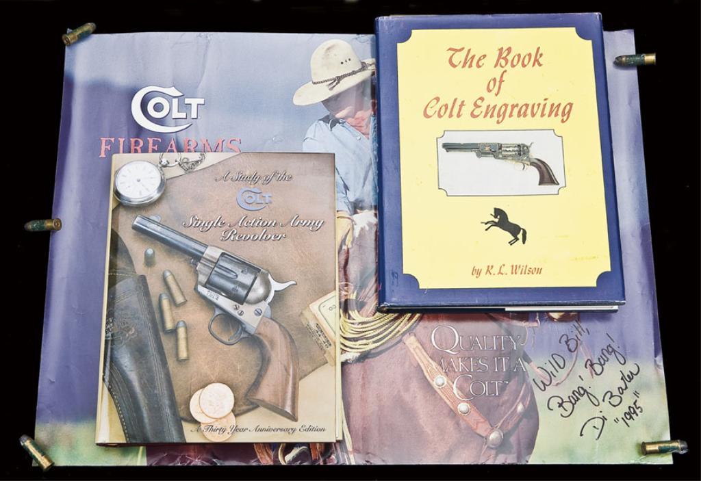 Lot of two reference books on Colt Firearms and a Colt Firearms poster with personal sentiment signature by Di Batler. The books include a first edition of The Book of Colt Engraving by R.L. Wilson with inscription by Al DeJohn and signed by Larry Wilson and a Thirty Year Anniversary Edition of A Study of the Colt Single Action Army Revolver, by Graham, Kopec and Moore. Both books are in very good condition and the poster is in good condition. Est.: $100-$150.