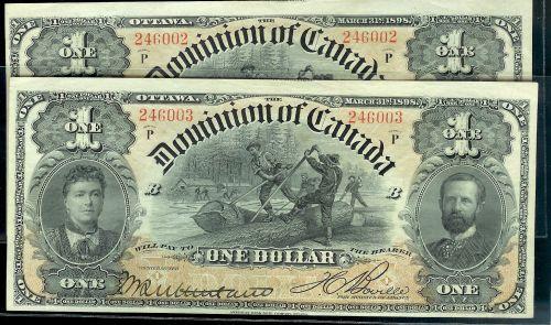 Lot of two sequential Dominion banknotes DC-13c 1898 $1 Boville 246002/246003 Series P. Both notes are original choice uncirculated with full embossing. Extremely rare! Worth a premium bid.