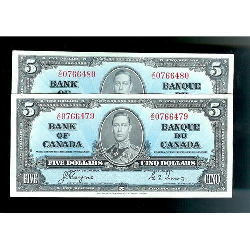 Lot of two sequential notes. BC-23C 1937 $5 Coyne-Towers Z/C0766479/480. Original uncirculated.