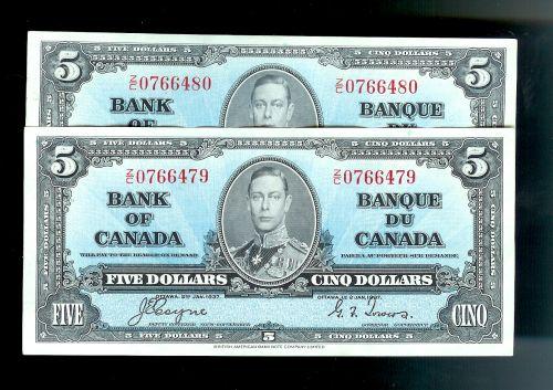 Lot of two sequential notes. BC-23C 1937 $5 Coyne-Towers Z/C0766479/480. Original uncirculated.