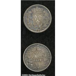 <B>Lot of two silver coins as follows:</B></I> KM723, 1/2 Franc 1827-A; and KM-794, 50 Centimes 1862-A. Both Very Fine. 2 coins <BR><BR><B>Important notice:</B> Heritage usually auctions material at the rate of 200-250 lots per hour. On some occasions eBay Live bid software or the Internet may not be able to keep up with the pace of the auction. We recommend placing a realistic absentee bid now as insurance to avoid disappointment. Occasionally the auctioneer may eliminate or reject an eBay Live bid, and the auctioneer may also reopen a lot after the close of the eBay live bidding (usually because we missed an audience bid), and may reject your bid even if it shows you as the winning bidder. By bidding via eBay Live, you agree that Heritage may award the lot to another bidder at its sole discretion under the circumstances described above or any other reasonable circumstances. Since eBay bids are not shown to us until we open the lot on the floor, we treat those bids just like floor bids. In most cases the floor responds before the eBay bid is presented to us, due to Internet lag time, so for consistency we have made it a policy that floor bids are always considered first over tie eBay live bids. Also please note that all Heritage lots purchased through eBay Live carry a 20% Buyer's Premium. Please make sure you read the Terms and Conditions before you bid.