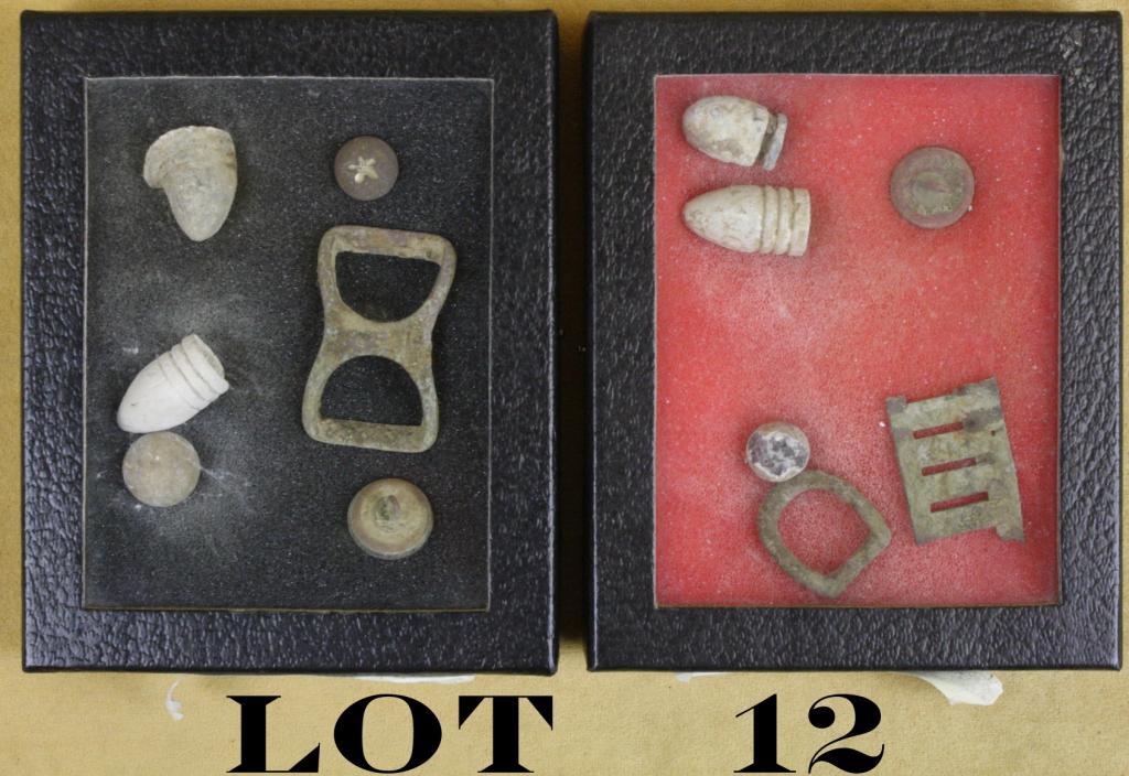 Lot of two small riker cases of Civil War dug up artifacts including six lead bullets, several uniform buttons and a couple misc. metal dug ups. Est.: $50-$75.
