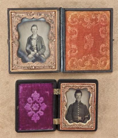 Lot of two small tintypes including 1) Union lieutenant with sword in uniform, measuring approx. 2-5/8” by 2-1/4”. Floral gutta-percha case. Image in very good condition, interior shows label Holmes, Booth, and Haydens. The image is in very good condition, just some slight aging, and well detailed including buckle and sword belt with sash. Along with 2) Young man in what may be a militia type uniform with military type belt buckle and buttons, approx. 3-1/2” by 3”. Image fair with some burning at the edges. Leather covered case has become disjointed at the seam, now taped, but complete. Est: $250 - $500