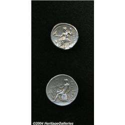 <B>Lot of two tetradrachms of Hellenistic kings.</B></I> Includes: Macedonian Kingdom. Alexander III. Nice VF, banker's mark on cheek // Seleukid Kingdom. Antiochos I. Fine. 2 coins <BR><BR><B>Important notice:</B> Heritage usually auctions material at the rate of 200-250 lots per hour. On some occasions eBay Live bid software or the Internet may not be able to keep up with the pace of the auction. We recommend placing a realistic absentee bid now as insurance to avoid disappointment. Occasionally the auctioneer may eliminate or reject an eBay Live bid, and the auctioneer may also reopen a lot after the close of the eBay live bidding (usually because we missed an audience bid), and may reject your bid even if it shows you as the winning bidder. By bidding via eBay Live, you agree that Heritage may award the lot to another bidder at its sole discretion under the circumstances described above or any other reasonable circumstances. Since eBay bids are not shown to us until we open the lot on the floor, we treat those bids just like floor bids. In most cases the floor responds before the eBay bid is presented to us, due to Internet lag time, so for consistency we have made it a policy that floor bids are always considered first over tie eBay live bids. Also please note that all Heritage lots purchased through eBay Live carry a 20% Buyer's Premium. Please make sure you read the Terms and Conditions before you bid.