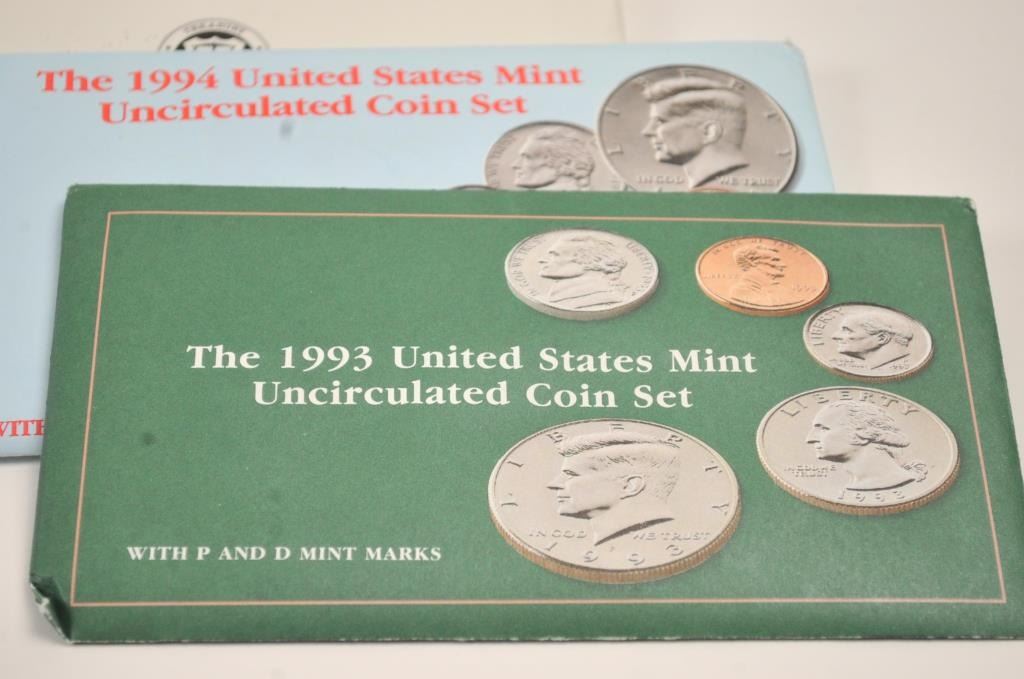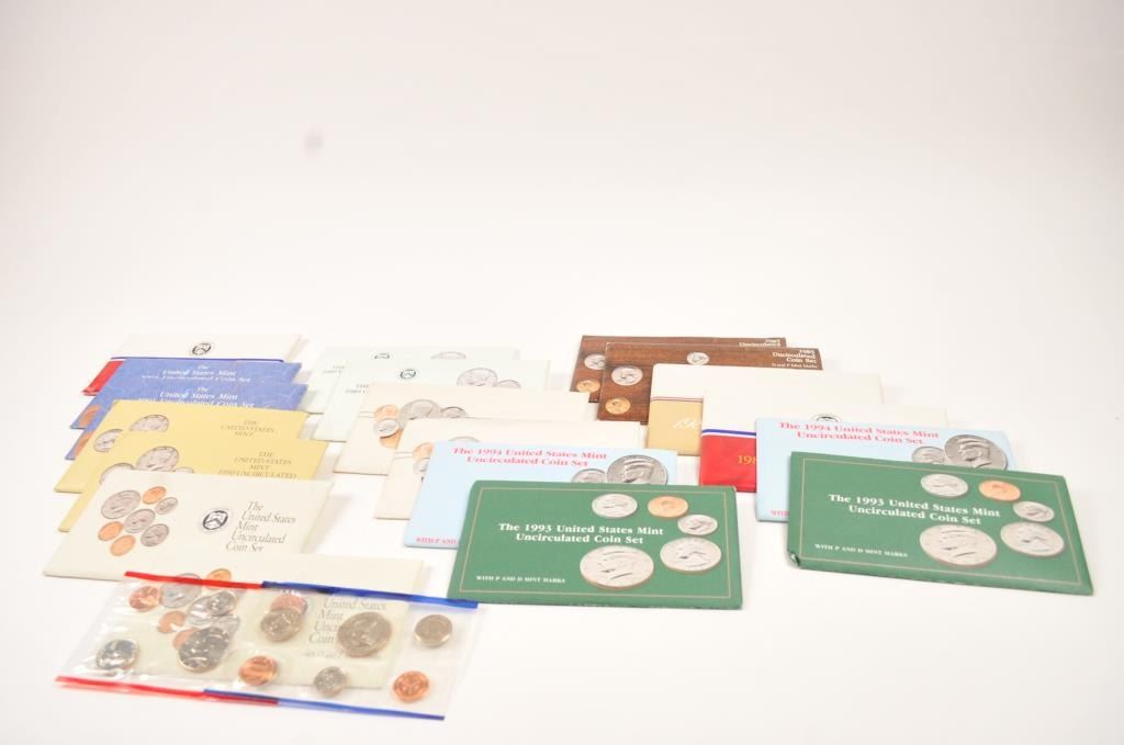 Lot of uncirculated U.S. coin sets. 1985-1994 in packs from P&D mints, 19 in total. Great for stocking stuffers. Est.: $175-$350.