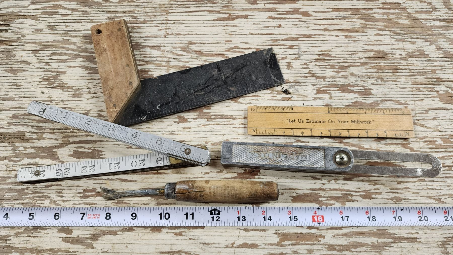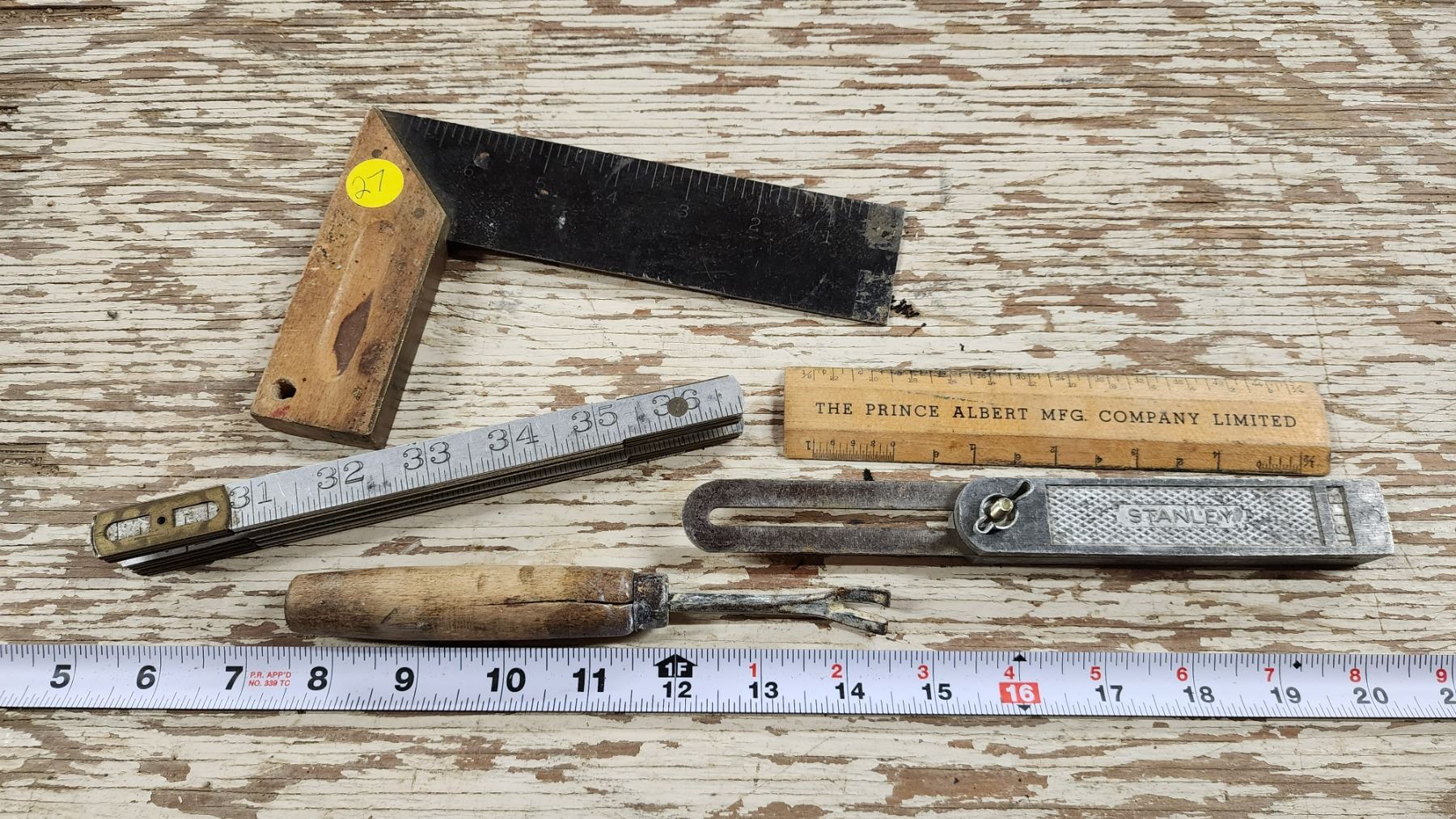Lot of vintage items - Square, Prince Albert ruler, metal folding ruler, angle finde, etc.