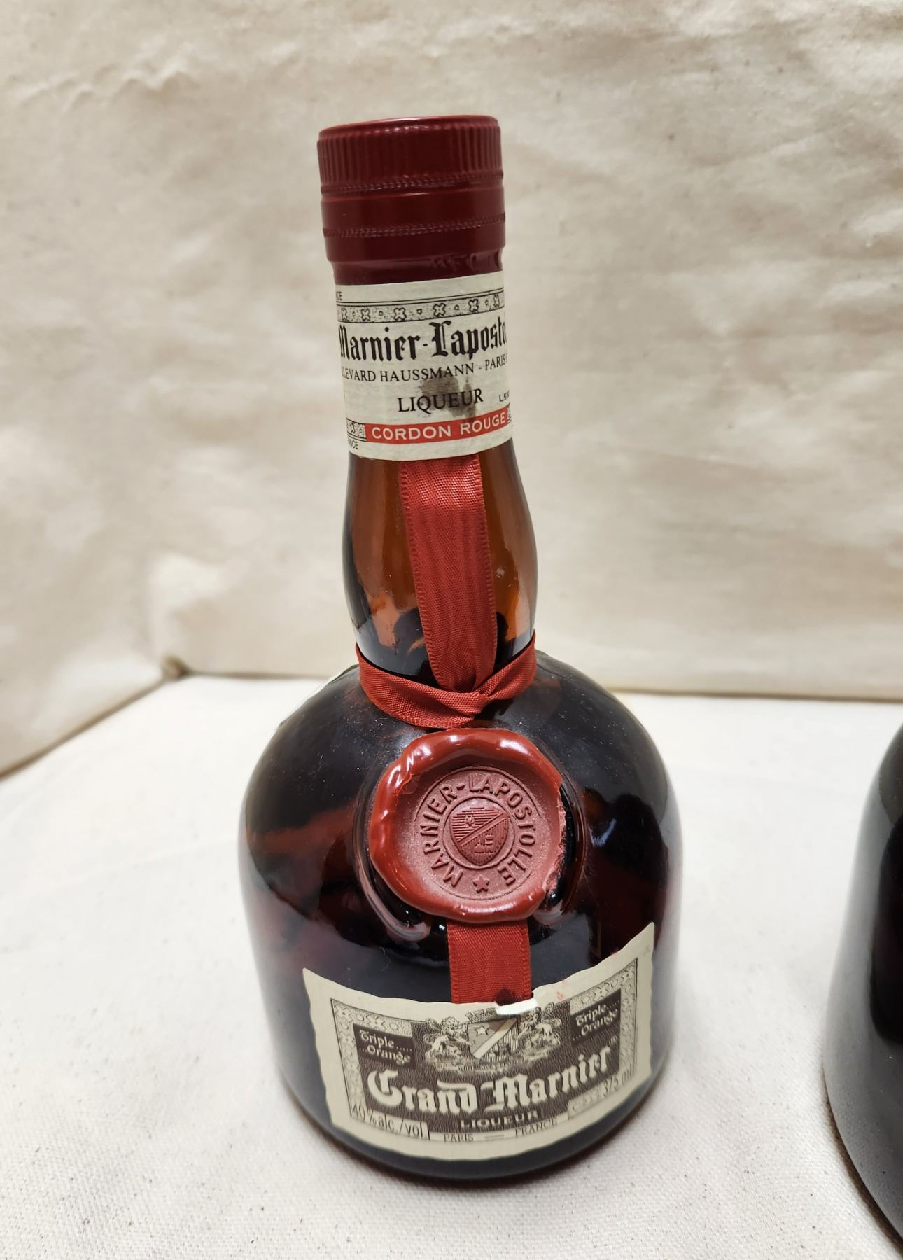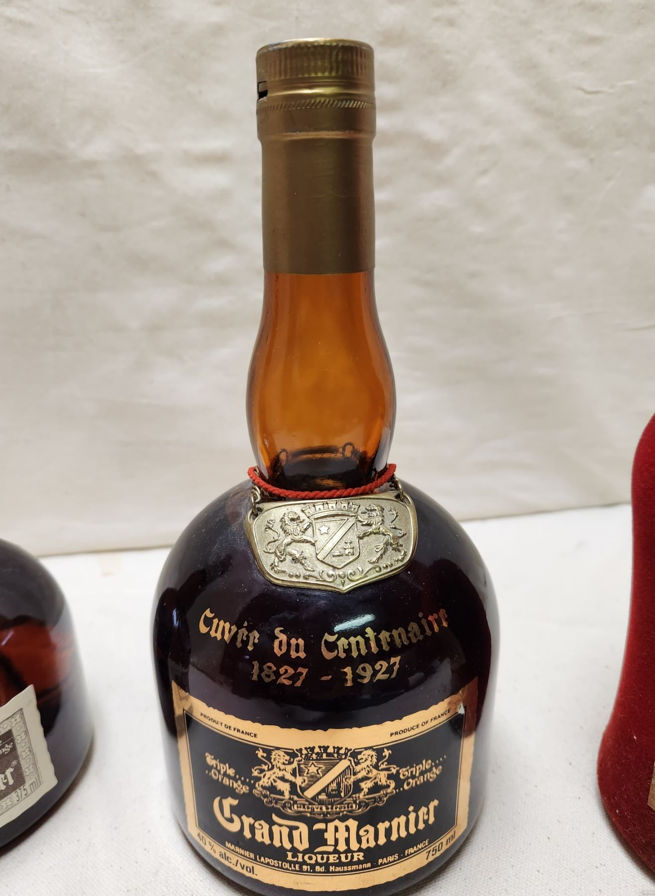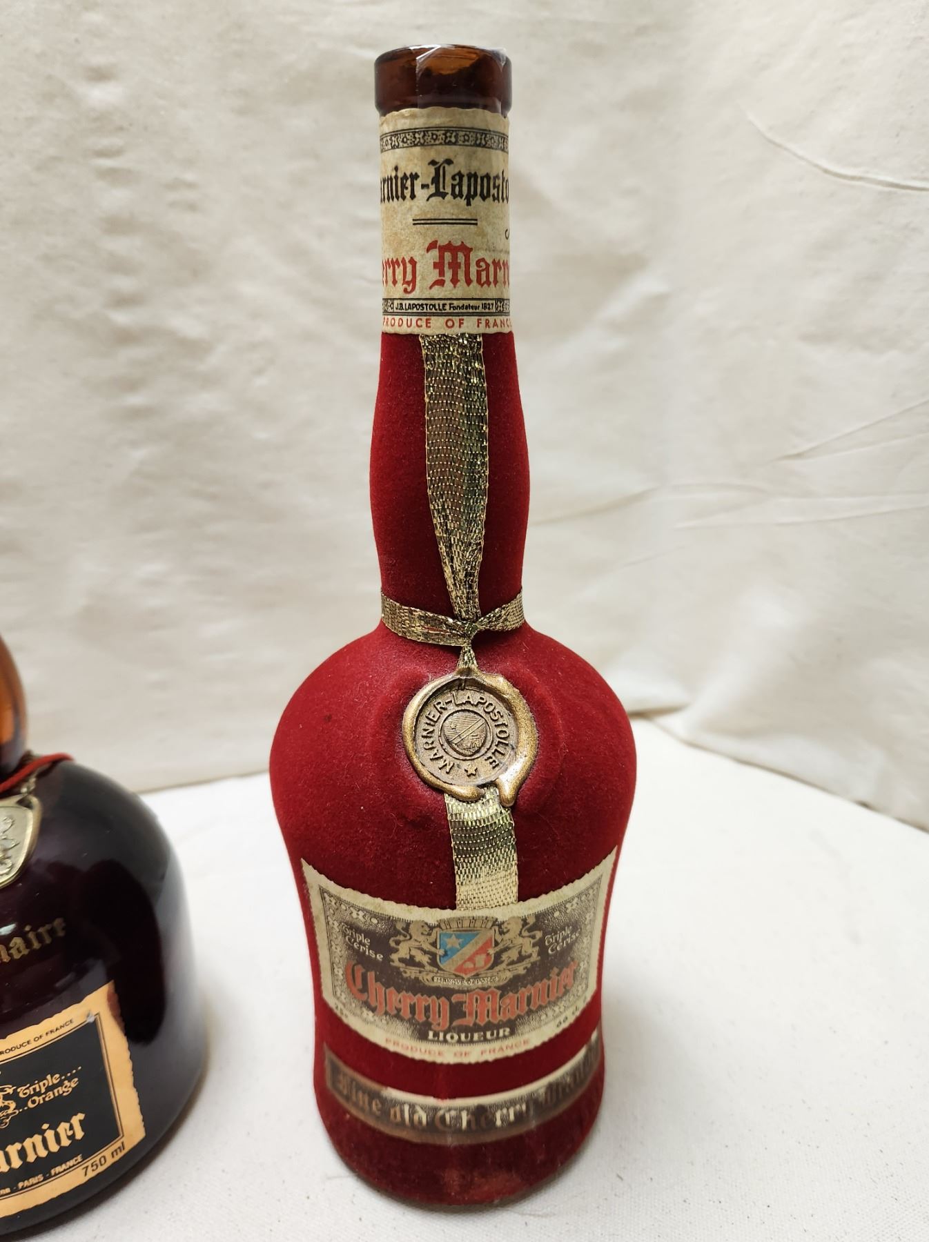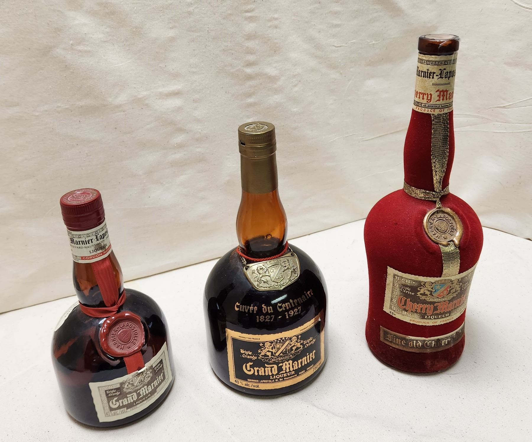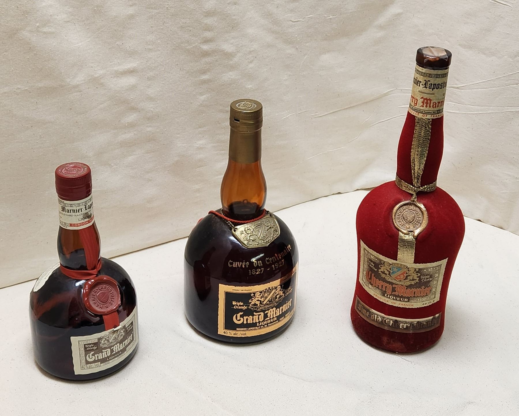 Grand Marnier Liqueur 1827-1927 at 40 % alc./vol. 750 ml, Cherry Marnier Liqueur Triple Cerise at 25 % alc./vol. 66 cl. Fine old cherry brandy. Special Edition in red velvet bottle. Product of France. Top of cork broken off. Sealed with no evaporation. (See pictures) and Circa 1970s Grand Marnier Liqueur Triple Orange at 40 % alc./vol. 375 ml.