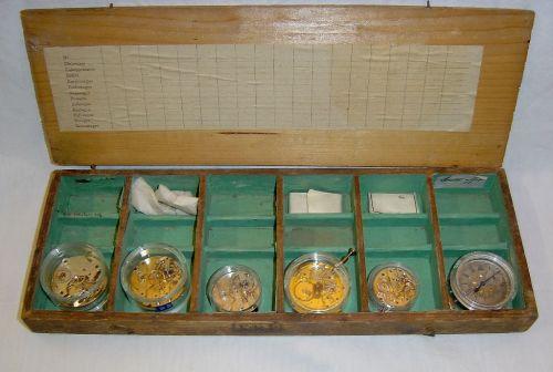 Boîte avec un lot de 6 mouvements intéressants: 1 demi squelette signé sur le cadran et le mouvement CALAME ROBERT ONDON, No 75299, 1 signé sur le cadran et le mouvement JULES JURGENSEN, 1 JAMES NARDIN LE LOCLE, No 10244, 1 répétition quarts avec remontage particulier, etc.