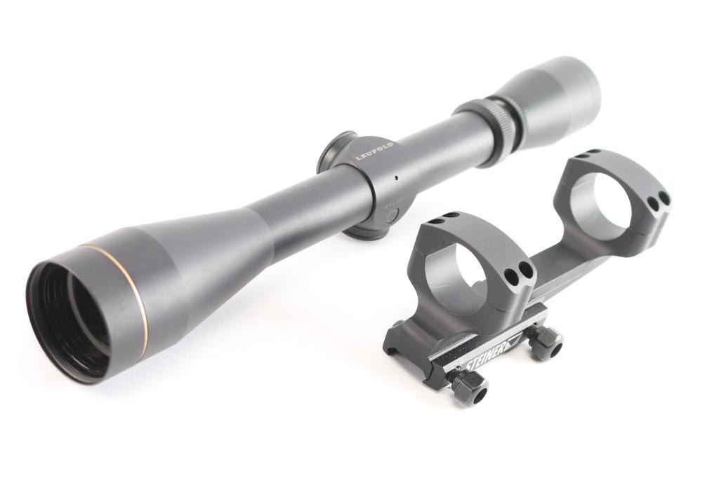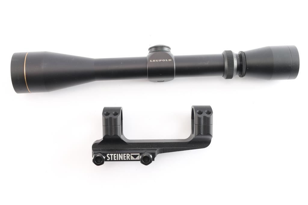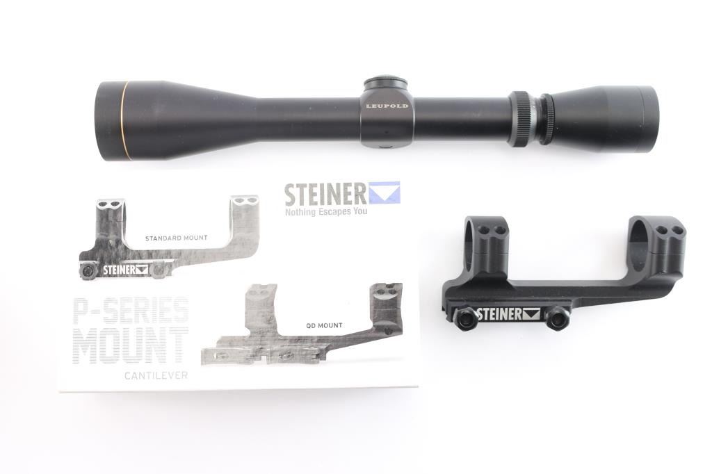 1) Leupold VX-1 3-9x40mm scope is a classic go-to for a mid-level, mid-priced rifle scope for the serious hunter. It features a matte finish, duplex reticle, a 1" tube, and 1/4" MOA elevation and windage adjustments. This is a very bright scope with a lot of light transmission using its four lens coatings on its, precision ground, lead-free glass. Accepts Alumina accessories. The condition of this scope is excellent. 2) Steiner 'P-Series' cantilever Mount provides a rigid method of mounting optics to a picatinny rail. This is commonly used for AR-15s, but can be fitted on any firearm with the appropriate rail. A cantilever design is more rigid than the classical two-piece designs, and doesn't require ring alignment. The standard mounting method is utilized with this mount which requires either a wrench or a socket, and the torque specifications are given on the rear of the box. The condition is excellent and looks to have been lightly used. Includes original factory box.