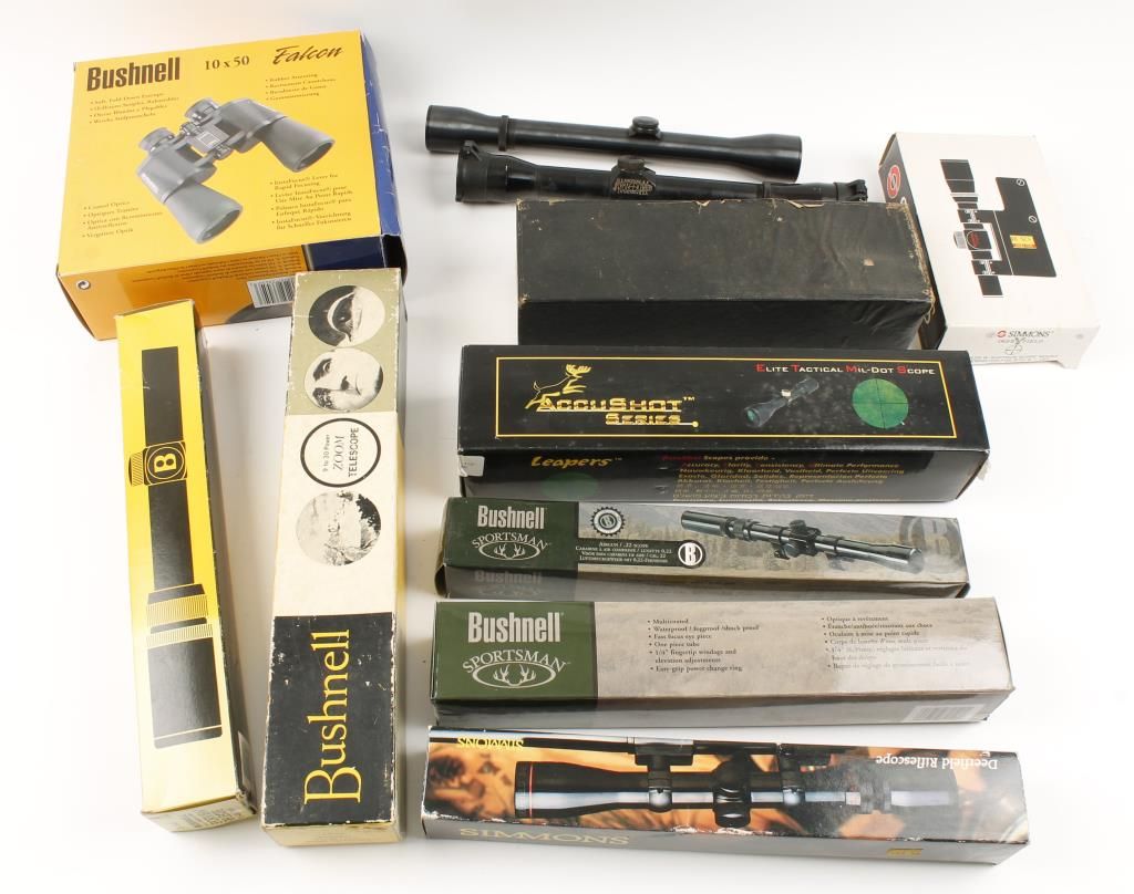 Includes (1)Bushnell Sportsman 3-7x20 scope, (1)Bushnell Sportsman 4x32mm rifle scope; (1)Bushnell Sportview 1.5-4.5x21mm rifle scope; (1)Bushnell 9-30 Zoom telescope; (1)Bushnell Falcon 10x50 binoculars; (1)Lyman 4x All American scope; (1)Weaver K4 scope; (1)Simmons 2.5x20 scope with shotgun scope mount; (1)Simmons Deerfield 1" 4x32 rifle scope; (1)Leapers AccuShot Series 3x9x40 Elite scope; and 2 tripods.