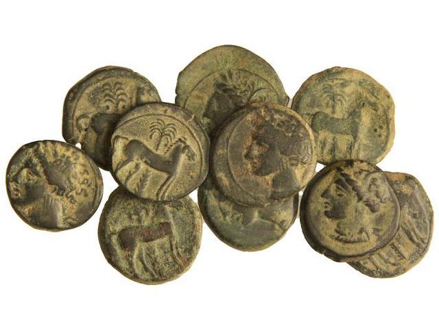 Lote 10 monedas 1/2 Calco. CARTAGONOVA. Anv.: Cabeza de Tanit a izquierda. Rev.: Caballo parado a derecha, detrás palmera. Pátina verde. A EXAMINAR. AB-507. MBC- a MBC+.