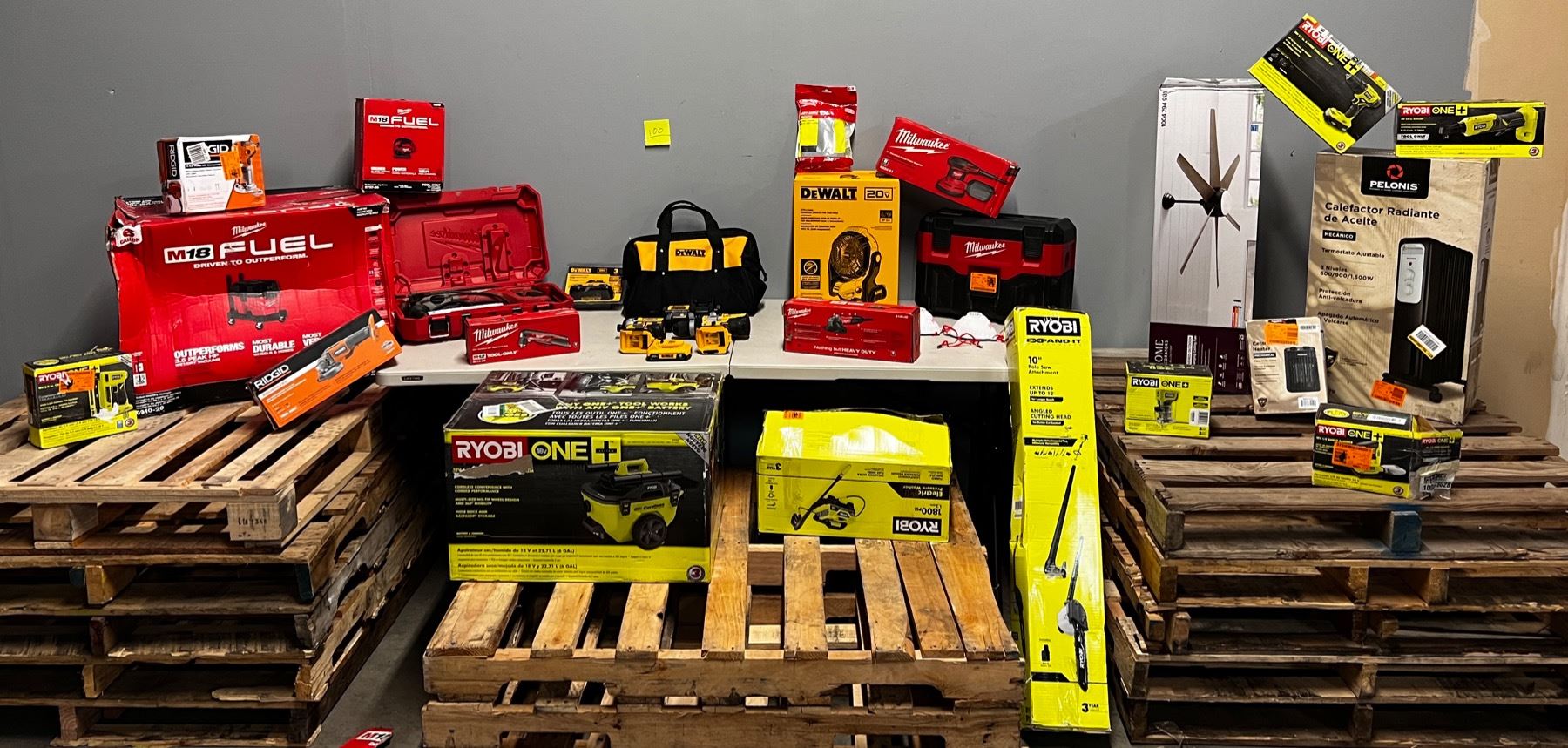 Lote de Herramienta y Home Improvements de la tienda Home Depot. Lote incluye aspiradoras Milwaukee, grinder Ridgid, taladros Dewalt, lijadora Ryobi, ratchet Ryobi, taladro Ryobi, calentones, fresadora compacta Ryobi, extension de sierra Ryobi, lavadora de presión Ryobi, aspiradora Ryobi, grinder Milwaukee, aspiradora Milwaukee, lijadora Milwaukee, abanico Dewalt, taladro ángulo recto Milwaukee, batería Dewalt, jackhammer Milwaukee, jig saw Milwaukee, tupí compacto Ridgid, aspiradora Milwaukee, y mucho mas.
