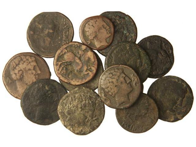 Lote 14 monedas 12 Ases y 2 Semis. BOSLCAN, SECAISA, SEGOBRIGA, CNOTERBIA CARBICA, CONTEBACOM, BEL y TURIASO. A EXAMINAR. BC a MBC.