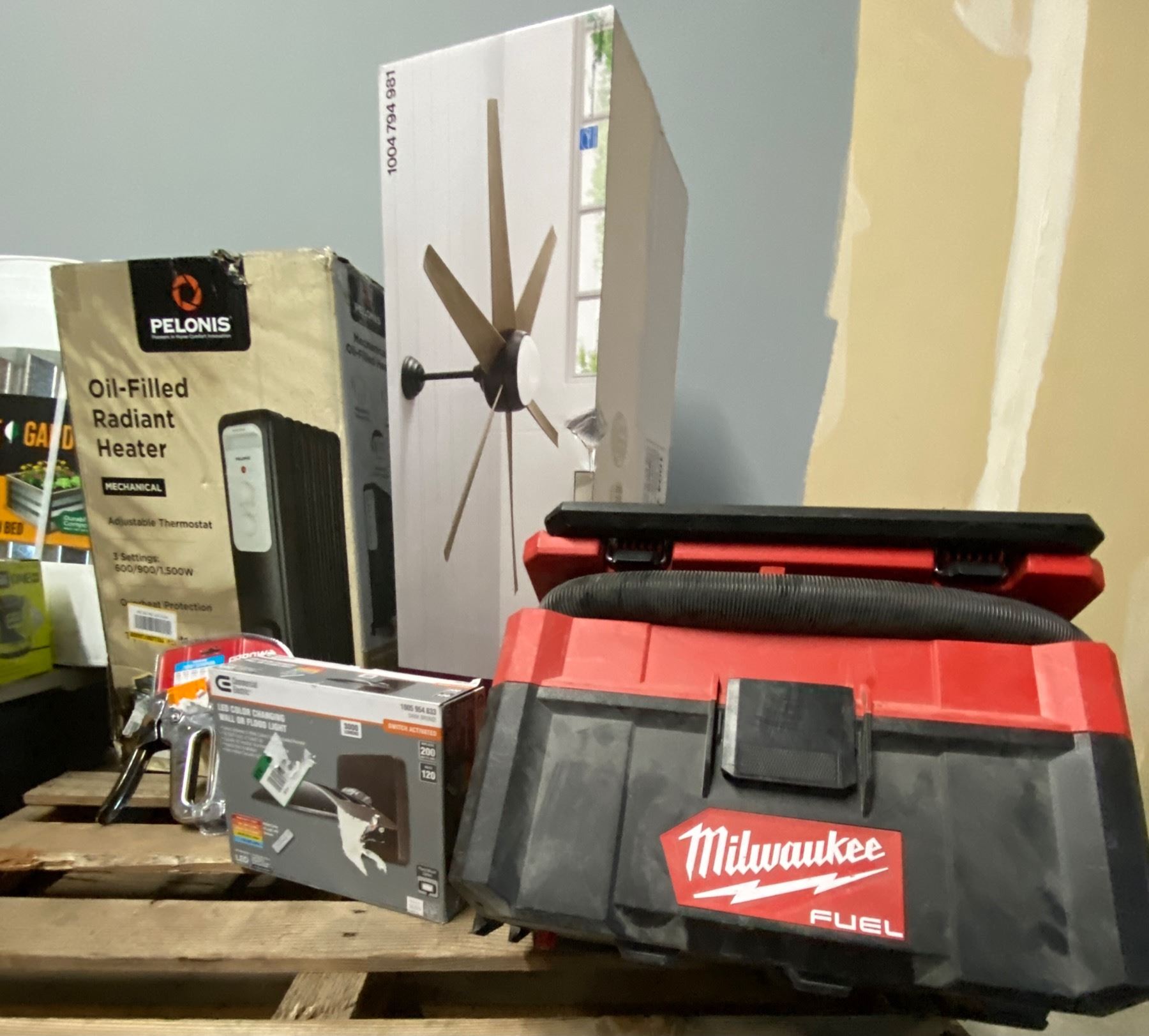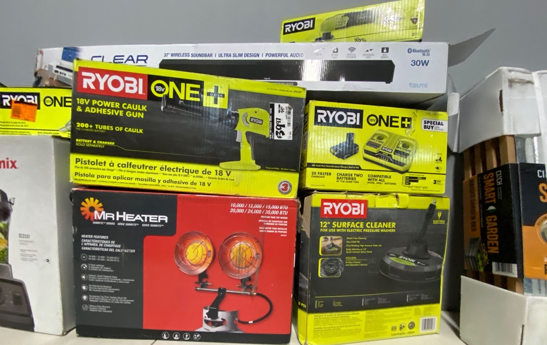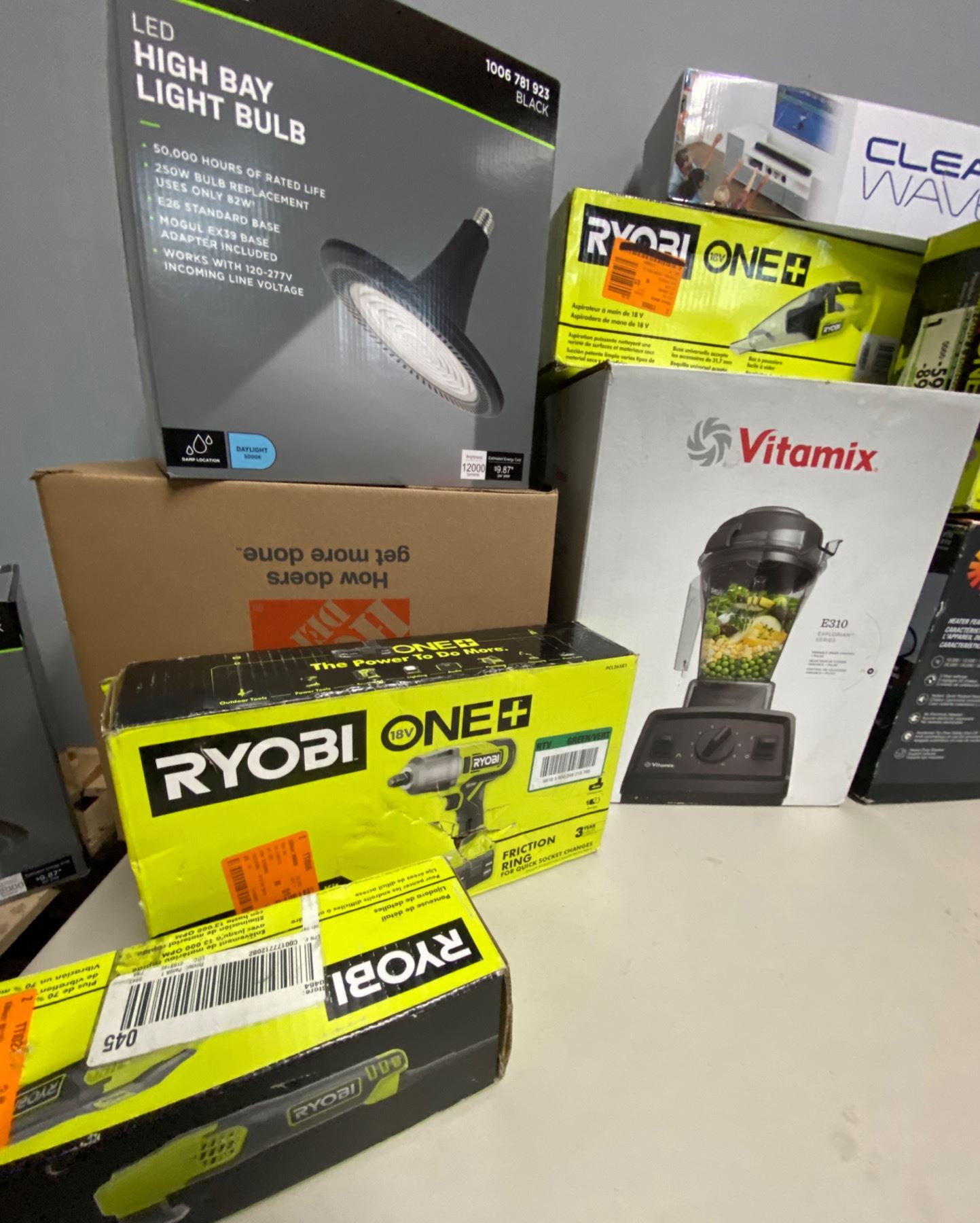 Lote de Herramienta y Home Improvements de la tienda Home Depot. Lote te incluye calentones, abanico de cielo, plantero, licuadora marca Vitamix, aspiradora Milwaukee, pistola de clavos, Ridgid, pistola de caulking Ryobi, limpiador de superficies, bara de sonido tzumi, lijadora Ryobi, focos para casa, y mucho mas.
