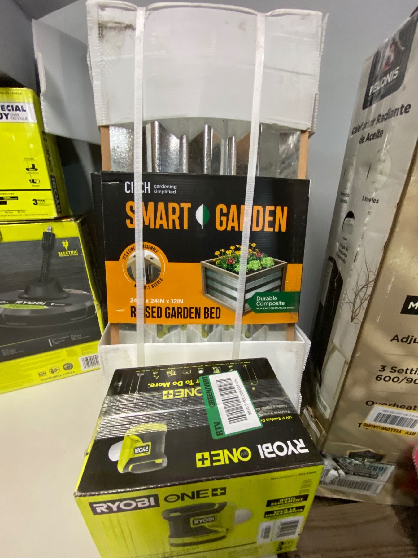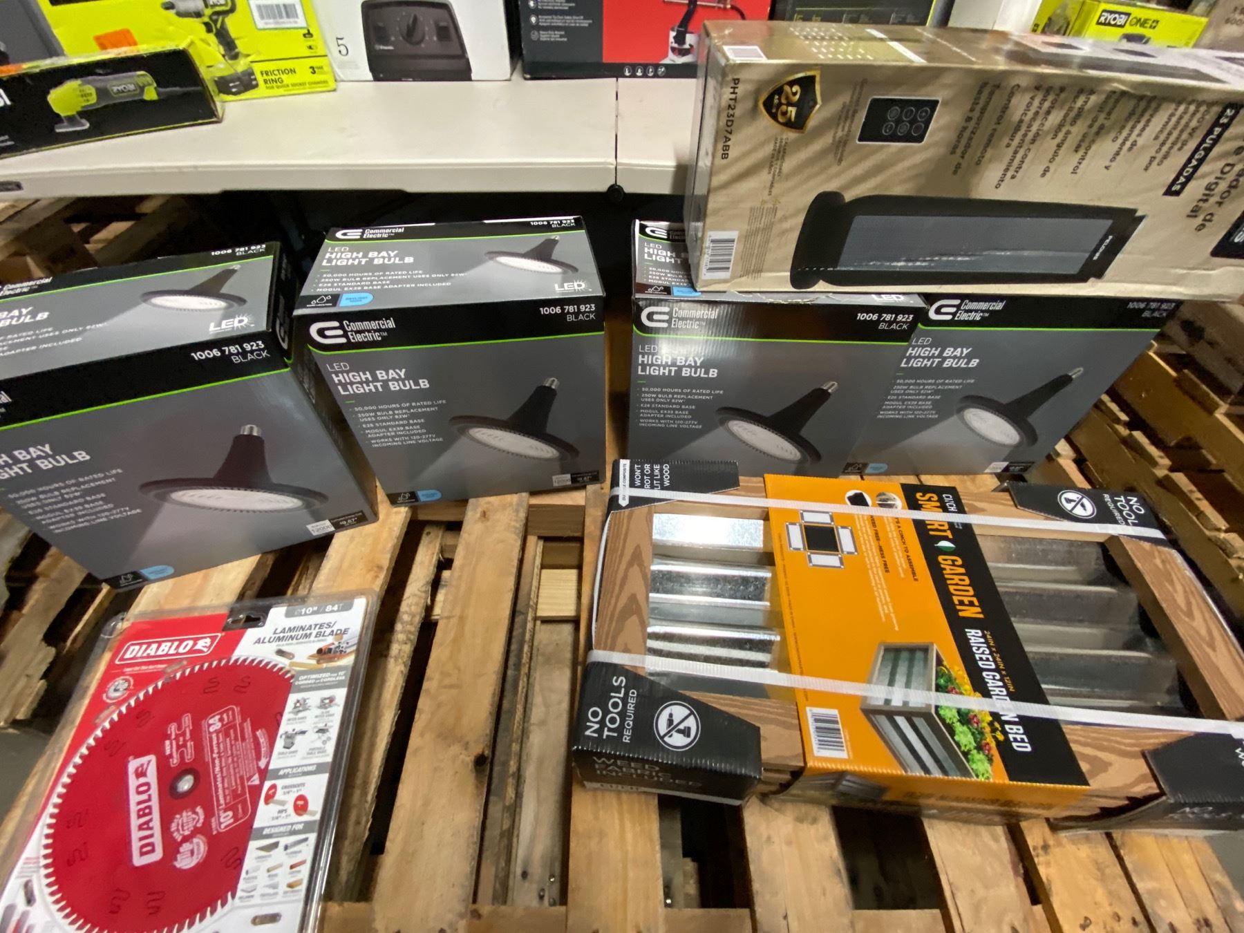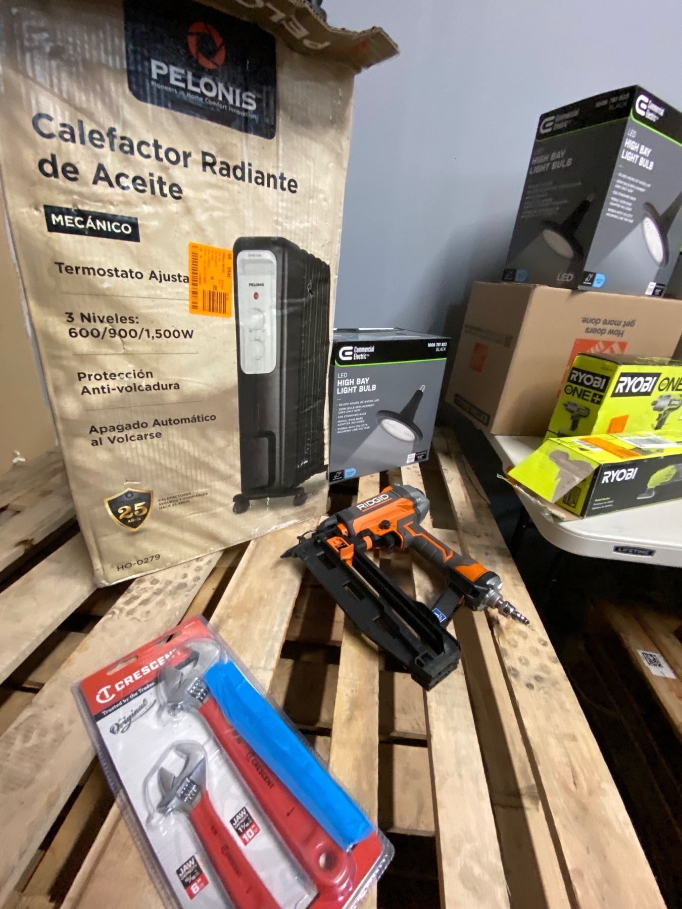 Lote de Herramienta y Home Improvements de la tienda Home Depot. Lote te incluye calentones, abanico de cielo, plantero, licuadora marca Vitamix, aspiradora Milwaukee, pistola de clavos, Ridgid, pistola de caulking Ryobi, limpiador de superficies, bara de sonido tzumi, lijadora Ryobi, focos para casa, y mucho mas.