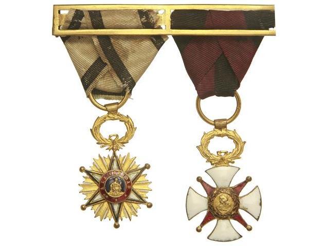 Lote 2 Condecoraciones en Pasador conjunto. Metal dorado y esmaltes. Contiene una cruz de Isabel II al Mérito en epidemia y otra cruz a la Beneficencia Pública. A EXAMINAR. MBC+ a EBC-.