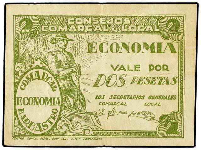 Lote 2 billetes 1 y 2 Pesetas. - S/F. - C. COMARCAL Y LOCAL ECONOMÍA BARBASTRO (Huesca). - (El de Peseta reforzado). Mont-232D y E. MBC-. - -