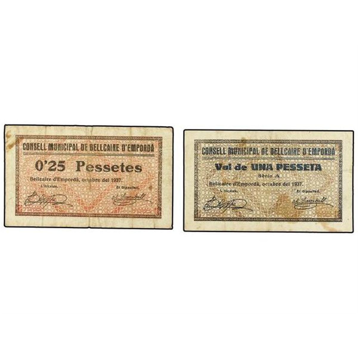Lote 2 billetes 25 Cèntims i 1 Pesseta. - Octubre 1937. - C.M. de BELLCAIRE D´EMPORDA. - (Algo sucios). AT-363/63; T-432/33. MBC/MBC+. - -