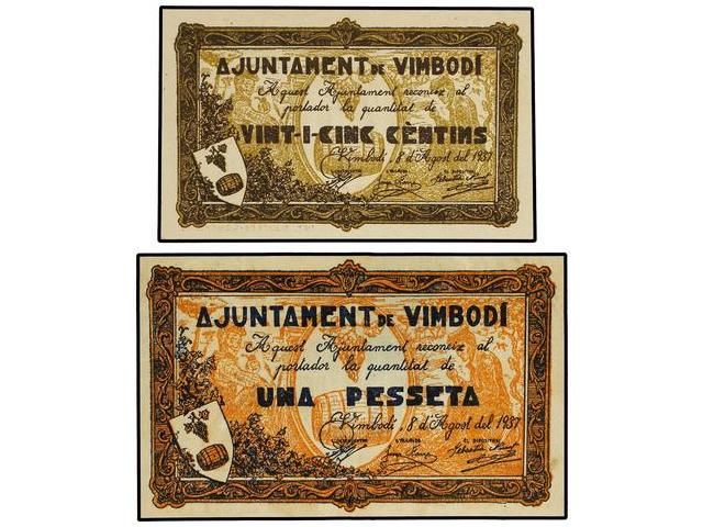 Lote 2 billetes 25 Cèntims y 1 Pesseta. 8 Agost 1937. Aj. de VIMBODÍ. AT-2906/2907. EBC a EBC+.