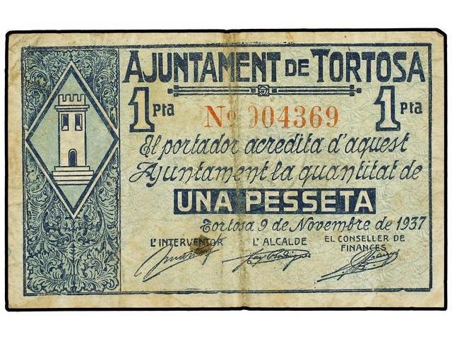 Lote 2 billetes 25 Cèntims y 1 Pesseta. 9 Novembre 1937. Aj. de TORTOSA. (El de 25 Cèntims, reparaciones y roturas). AT-2580, 2582; T-2998, 3000. BC y MBC-.