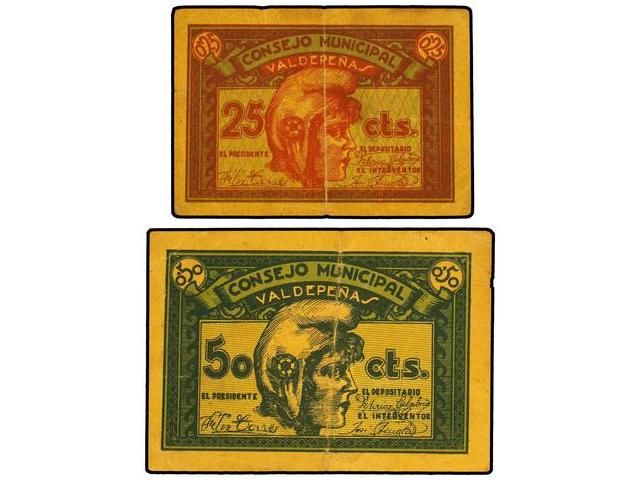 Lote 2 billetes 25 y 50 Céntimos. C.M. de VALDEPEÑAS (Ciudad Real). Mont-1505a y b. MBC.