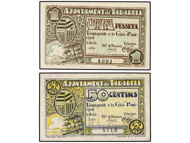 Lote 2 billetes 50 Cèntims y 1 Peseta. S/F. Aj. de TARADELL. (50 Cèntims leve manchita). AT-2432 y 2433; T-2824 y 2825. EBC y SC.