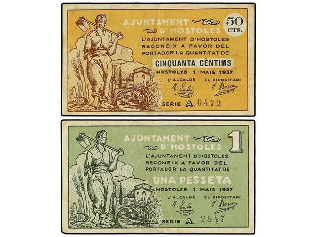 Lote 2 billetes 50 Cèntims y 1 Pesseta. 1 Maig 1937. Aj. d´HOSTOLES. AT-1250/51; T-1437/38. MBC+.