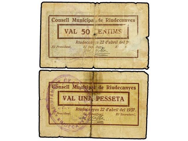 Lote 2 billetes 50 Cèntims y 1 Pesseta. 22 Abril 1937. C.M. de RIUDECANYES. (Erosiones de papel. Roturas restauradas). ESCASOS. AT-2158/59; T-2495/96. BC.