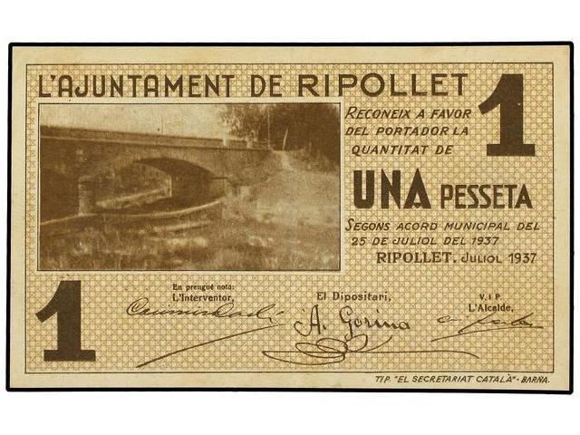 Lote 2 billetes 50 Cèntims y 1 Pesseta. 25 Juliol 1937. Aj. de RIPOLLET. AT-2142, 2142c; T-2478, 2479c. MBC- a MBC+.