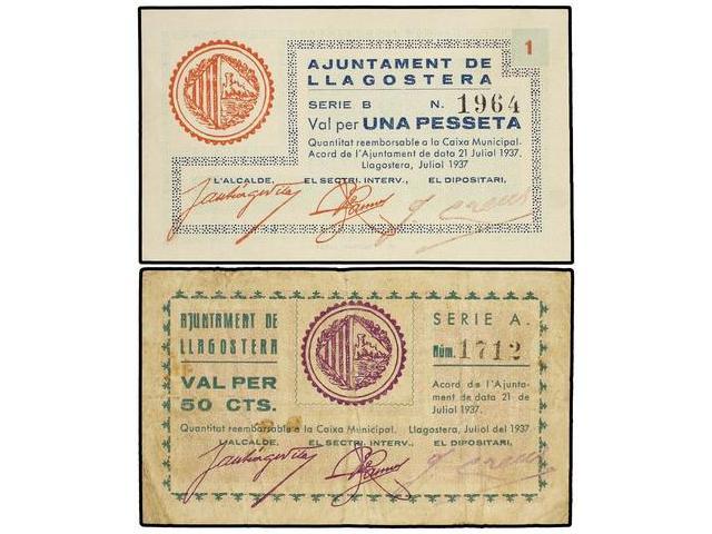 Lote 2 billetes 50 Cèntims y 1 Pesseta. Aj. de LLAGOSTERA. (El de 50 Cèntims sucio). AT-1323/4; T-1516/17. MBC y SC.