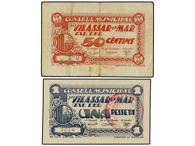 Lote 2 billetes 50 Cèntims y 1 Pesseta. C.M. de VILASSAR DE MAR. (50 Cèntims algo sucio). AT-2887/88; T-3333/34. MBC y EBC.