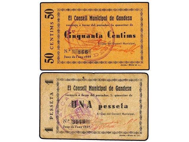 Lote 2 billetes 50 Cèntims y 1 Pesseta. Juny 1937. C.M. de GANDESA. Cartones. AT-1081/82; T-1252. MBC y EBC+.